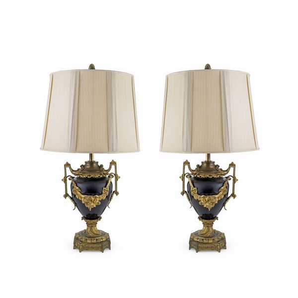 Coppie di lampade in metallo dorato e porcellana blu cobalto