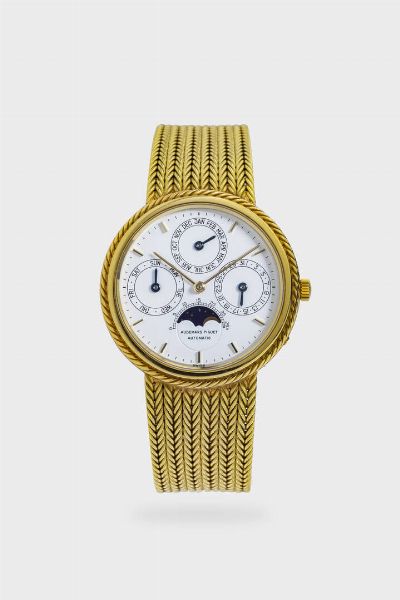 Diam. 36 mm Cassa in oro decorata con bracciale solidale alla carrure. Quadrante bianco recante indici applicati e 4 sub-contatori. Ad ore 3 troviamo l'indicazione della data ad ore 6 troviamo l'indicazione delle fasi lunari al 9 l'indicazione del giorno della settimana ed al 12 il mese dell'anno Movimento a carica automatica cal.2120\2180 Orologio in condizioni esemplari mai lucidato. Completo di estratto dagli archivi Audemars.