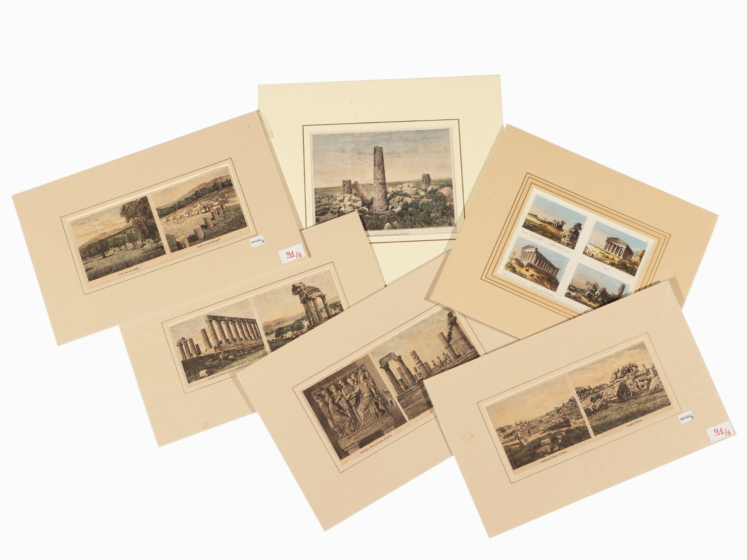 XIX secolo sei incisioni su legno e su acciaio, acquerellate, con passe-partout