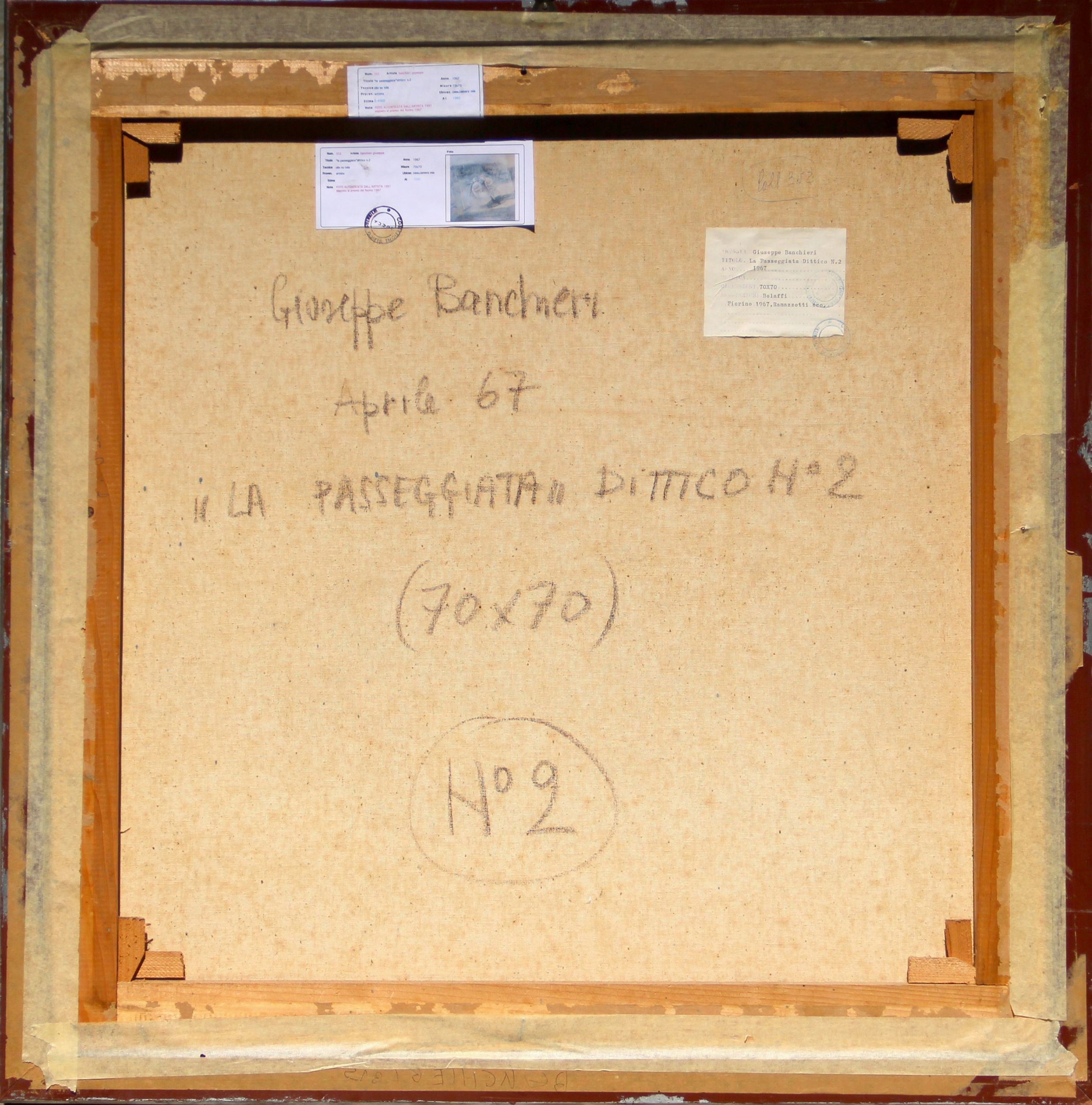 1967 Firma, data 'G. Banchieri, 67' (in basso a destra) Firma, data, titolo, scritta, misura 'Giuseppe Banchieri, Aprile 67, La passeggiata, dittico n. 2, 70x70'; etichetta e timbro della collezione Guerrieri (al retro)