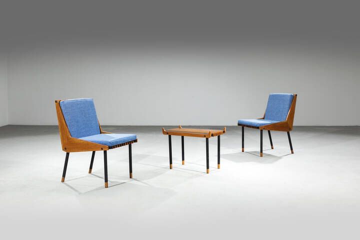 Struttura in legno a canelle e metallo verniciato imbottitura rivestita in tessuto e particolari in ottone. Anni '50 cm 77x50x59 cm 42x55x34 Difetti