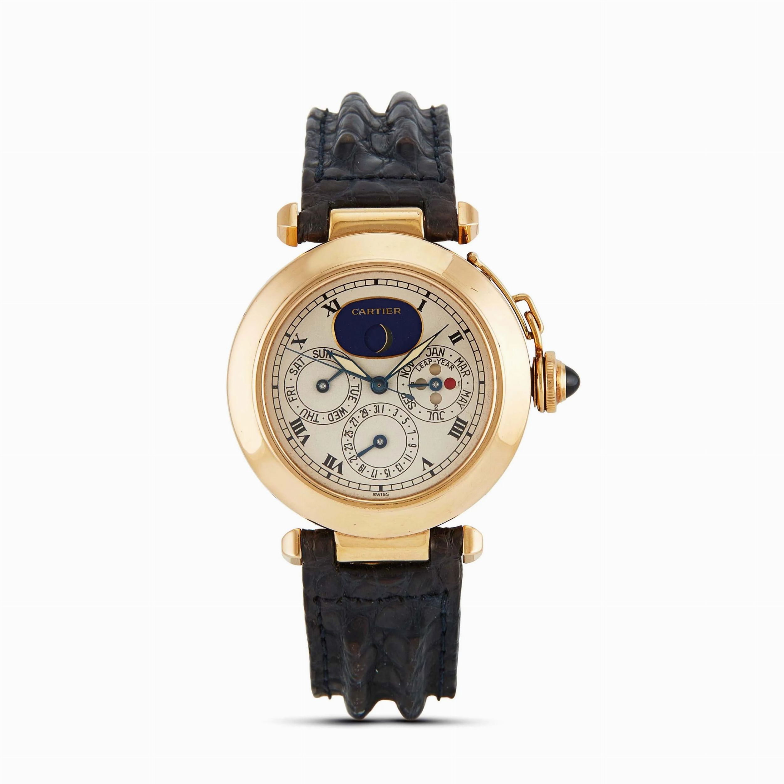 cassa in oro giallo 18kt, fondello serrato con viti, anse mobili, copricorona avvitato con catena, corona con pietra cabochon blu, quadrante avorio, grafica nera, numeri romani stampati, fasi lunari, calendario perpetuo con disco della settimana e del mese, movimento al quarzo, cinturino in pelle nera con fibbia in oro giallo 18kt originali, vetro minerale, gr. 97. Diam. mm 38