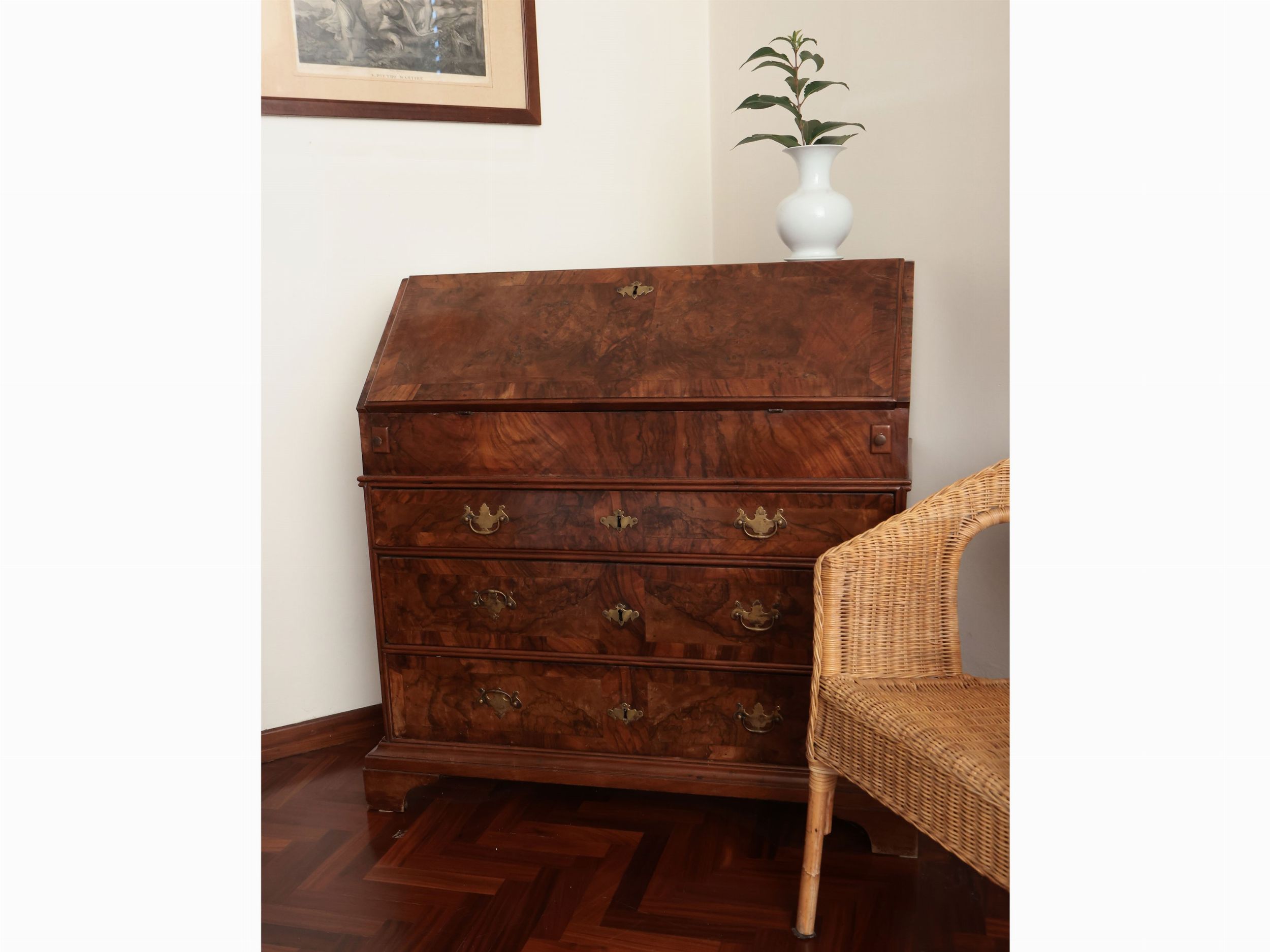Cassettone a ribalta impiallacciato ed intarsiato in radica di noce