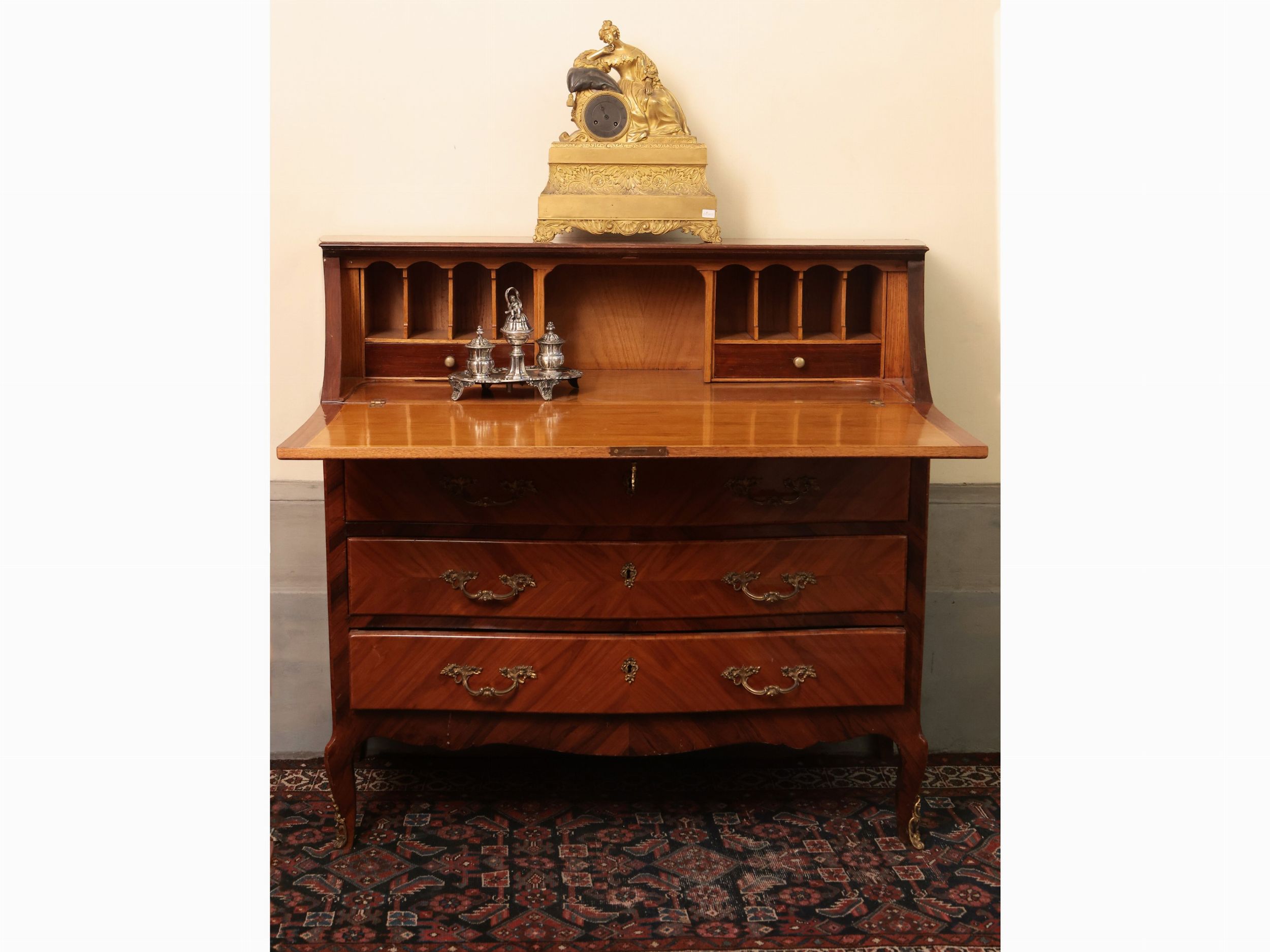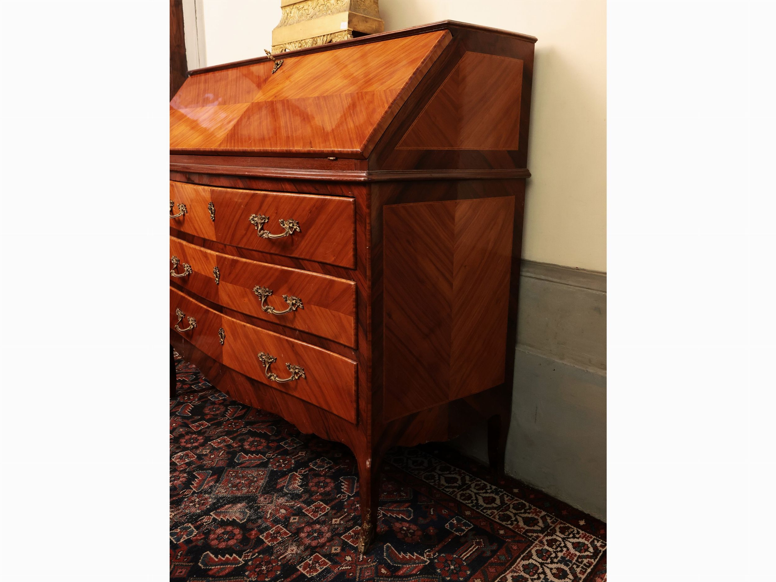 Cassettone a ribalta impiallacciato in legno di rosa ed altre essenze
