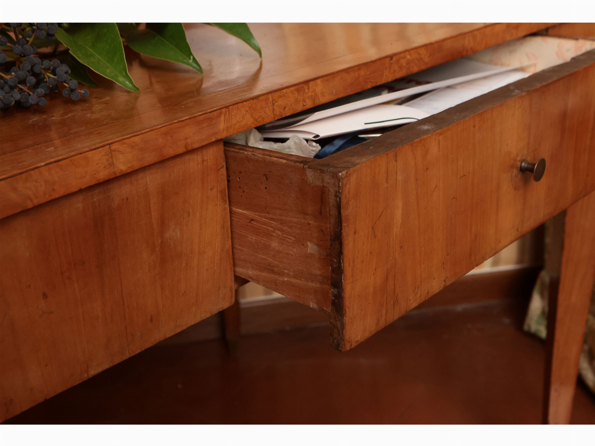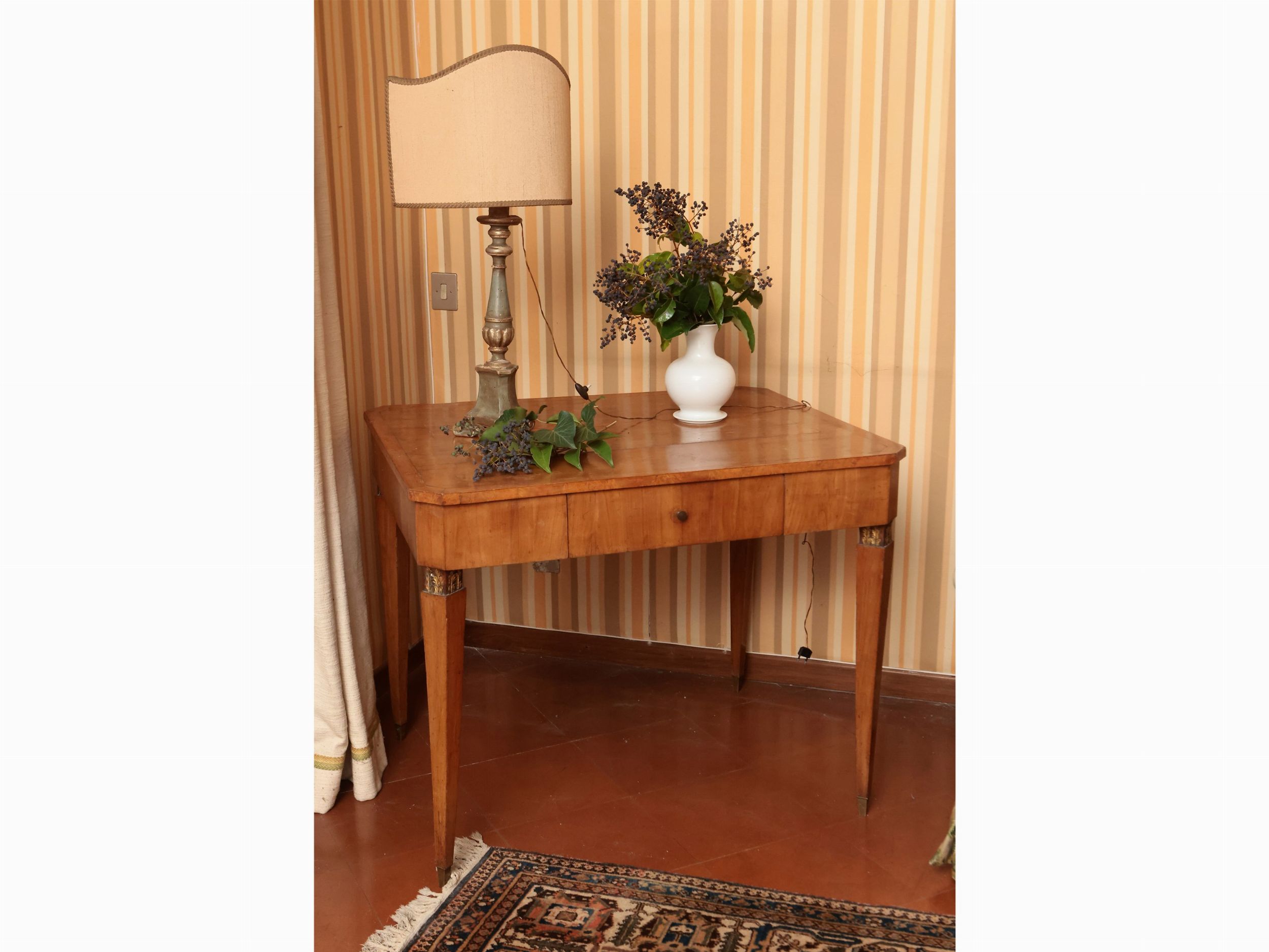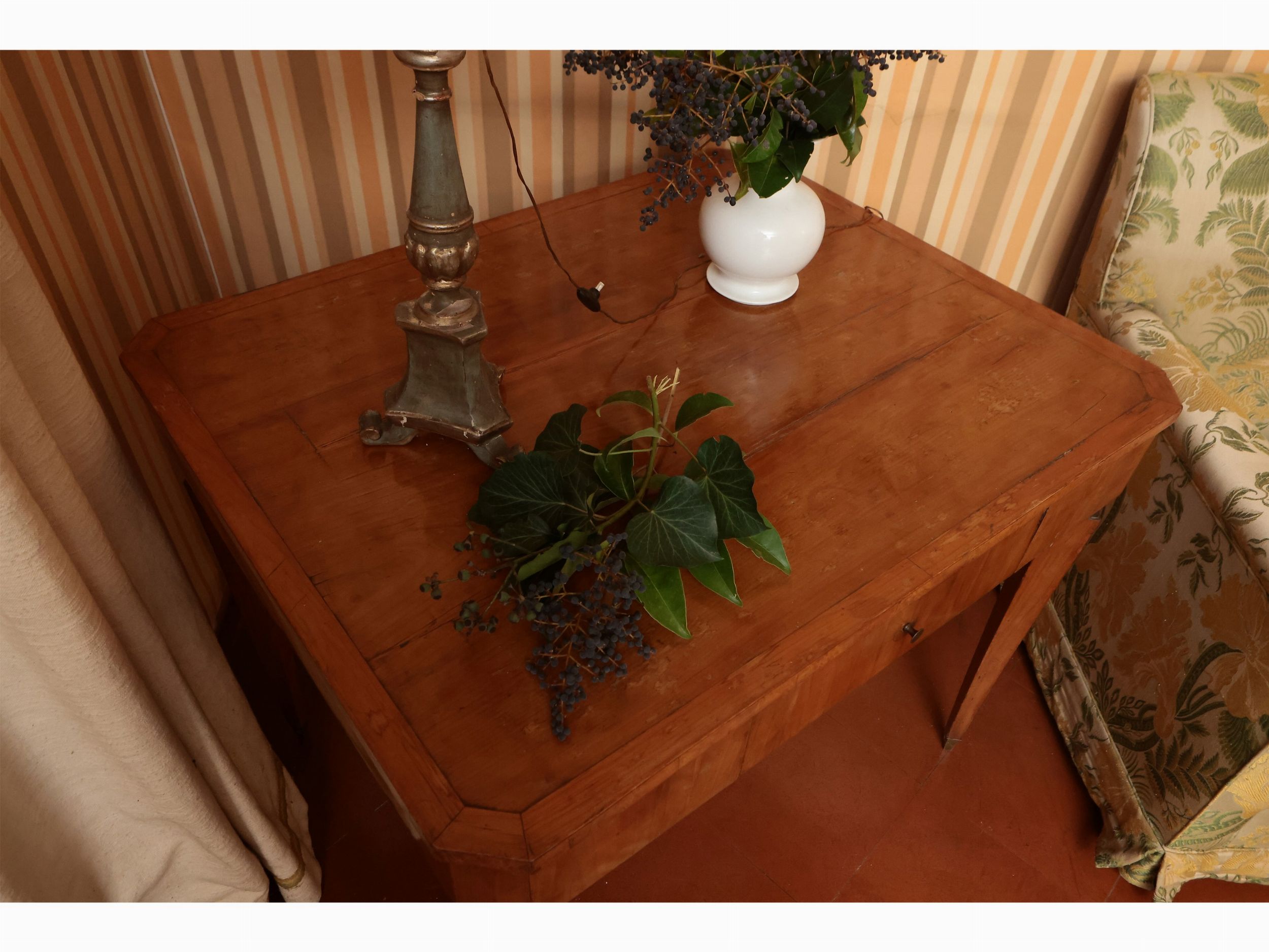 fine del XVIII secolo piano con angoli scantonati, un piccolo cassetto nella fascia, gambe a faretra con collarino intagliato e lumeggiato in oro con foglie d'acanto, piedini a vaso, alcuni difetti