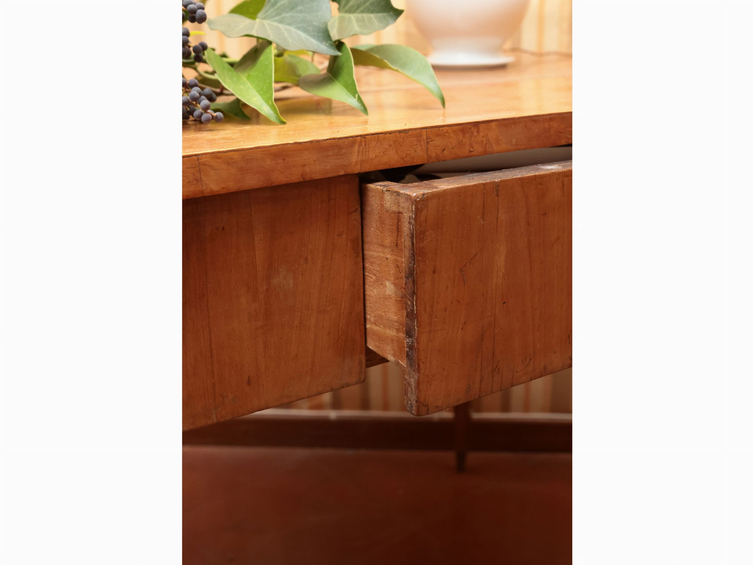 Tavolo impiallacciato ed intarsiato in ciliegio