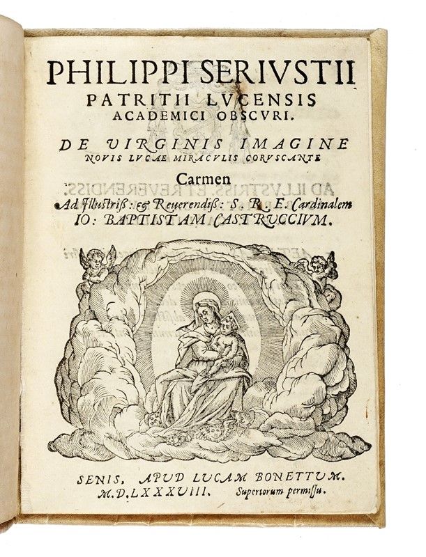 In-4° (mm 200x154). Pagine: 23, [1]. Frontespizio con grande e bella vignetta xilografica raffigurante la Vergine col Bambino, armi del dedicatario al verso. Testo in corsivo con carte fresche e croccati. In fine marca xilografica entro cornice figurata rappresentante la lupa che allatta Romolo e Remolo. Pergamena flessibile moderna.