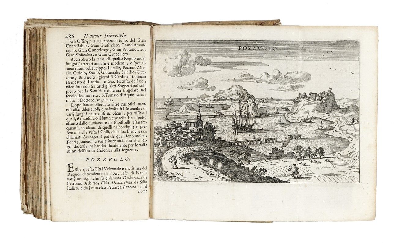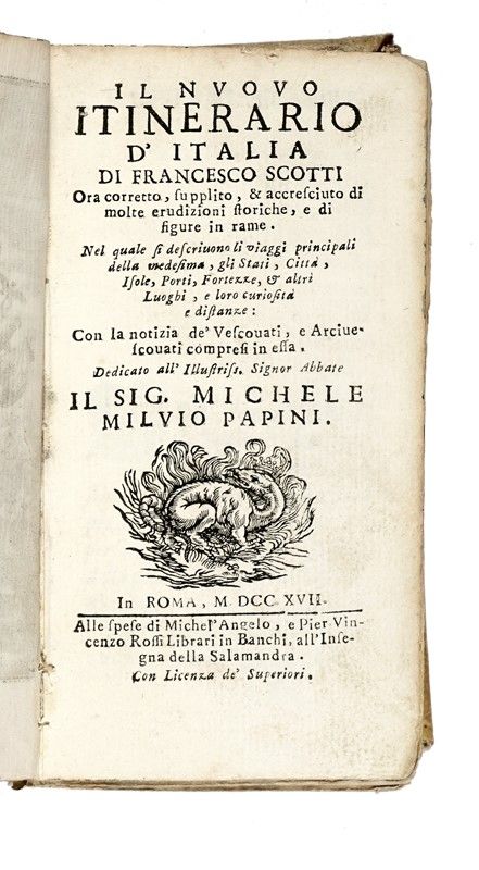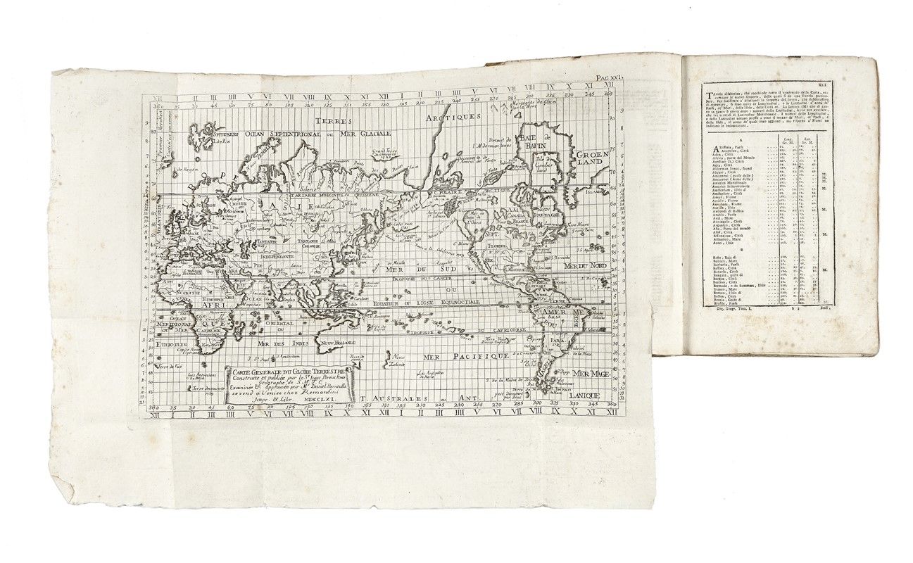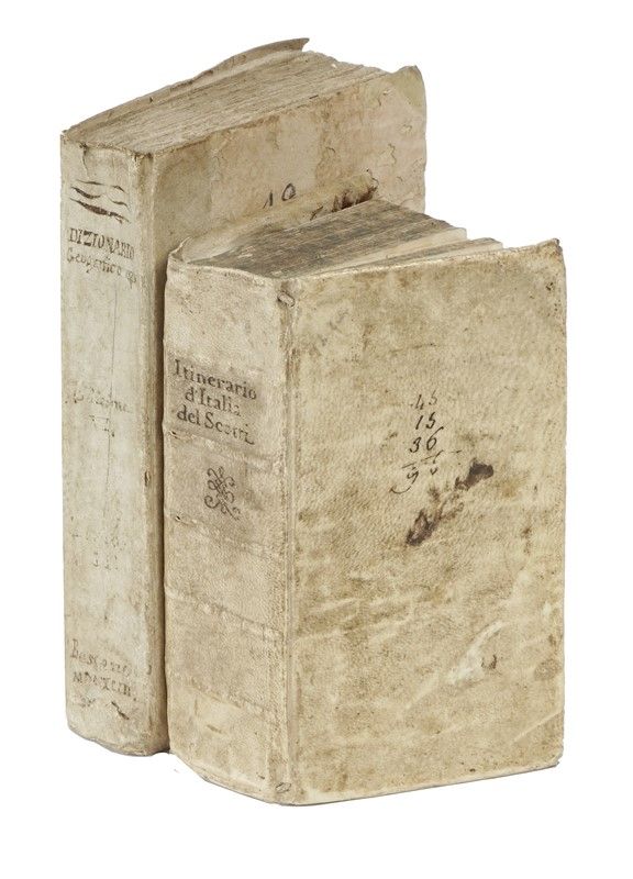 In-12° (mm 160 x 88). Testo scompleto e con qualche traccia del tempo, ma presenti l'antiporta e le 25 mappe calcografiche ripiegate (24 città e 1 dell'Italia). Pergamena semi-flessibile coeva con titolo manoscritto al dorso, tagli spruzzati (allentata e con tracce del tempo). SI AGGIUNGE: Echard Laurence, Dizionario geografico portatile [...] Tomo primo [- secondo]. A Bassano: a spese di Remondini di Venezia, 1793. Non collazionato ma presenti i due mappamondi ripiegati. In barbe, minime fioriture marginali, in mezza pergamena coeva (qualche difetto).