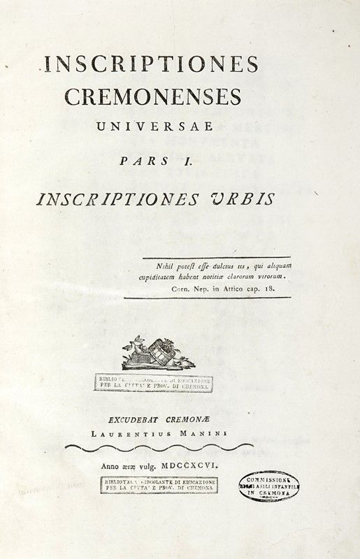 In 4° (mm 337x227). Copia in barbe, con carte fresche. [RILEGATO CON:] Inscriptiones Cremonenses solo ordine locorum..., Excudebat Cremonae: Laurentius Manini, 1796. Non collazionato. Cartonato rigido coevo con tassello rosso al dorso (sbucciature ed abrasioni).
