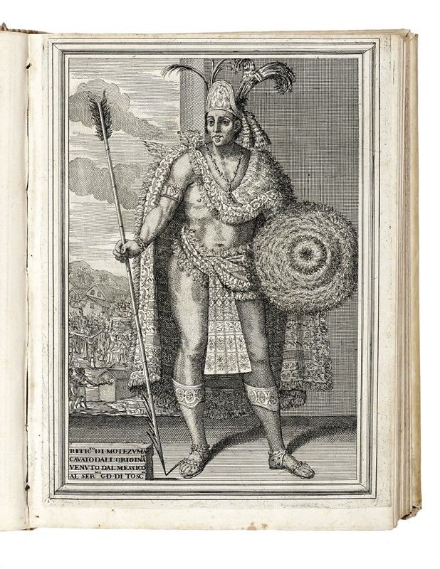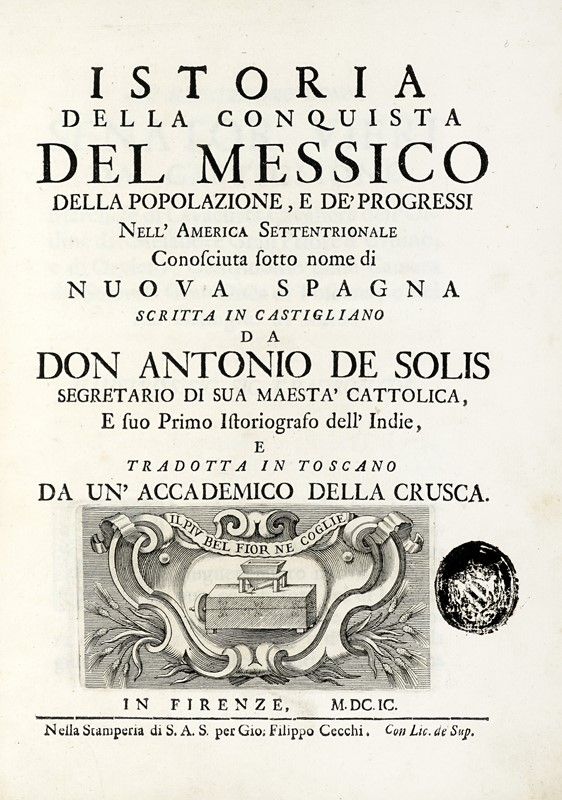 In-4° (mm 268x197). Con 1 ritratto dell'Autore in antiporta, 1 ritratto di Cortés, 1 ritratto di Montezuma, il tutto in rame fuori testo. Marca calcografica dell'Accademia della Crusca al frontespizio; testatine e finalini incisi in rame con immagini relative agli avvenimenti descritti (antico timbro nobiliare al frontespizio, strappetto marginale alla p. 546, qualche rara macchiolina). Buona copia completa e marginosa con belle carte croccanti, in pergamena rigida coeva, tagli spruzzati di rosso e verde (legatura leggerissimamente allentata in punti).