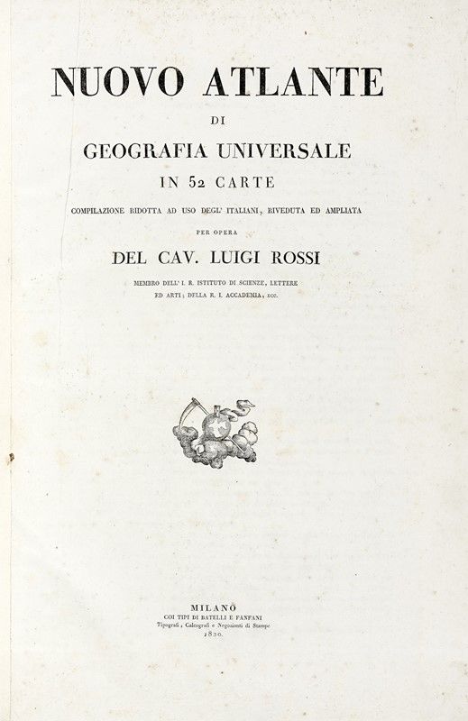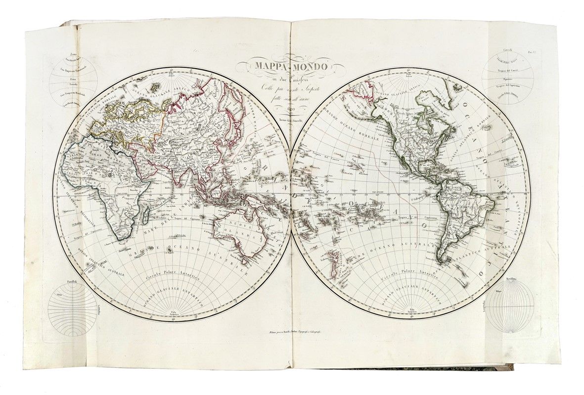 In-folio (mm 445x294). Pagine XX, 150. Con 52 tavole calcografiche fuori testo, alcune delle quali più volte ripiegate; molte con i confini in fine coloritura d’epoca. Atlante completo ma pp. [viii]-xx rilegate tra pp. 136-137, fioriture alla parte di testo e in poche tavole. La maggior parte delle tavole è in fresca e nitida tiratura. Legatura in mezza pergamena, con piatti rivestiti in carta marmorizzata e titoli in oro su tassello al dorso. Qualche abrasione e segno di usura, altrimenti buono stato di conservazione.