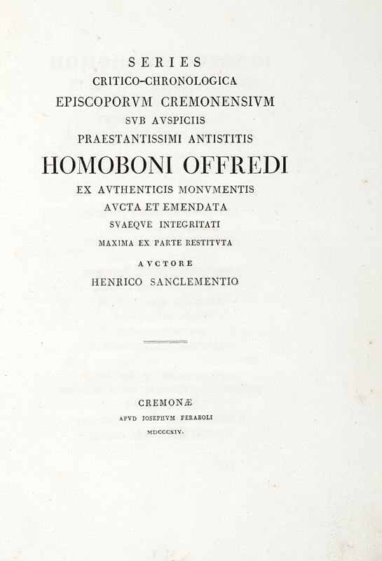 In-folio (mm 311x216). Carte pesanti, occasionalmente fiorite in modo pallido. Legatura in piena pelle con cornice dorata ai piatti, titoli e decorazioni dorate al dorso, sguardie in carta decorata, tagli rossi (sciupata). SI AGGIUNGE: Peri Angelo, Vocabolario cremonese italiano. Cremona: tipografia vescovile di Giuseppe Feraboli, 1847. SI AGGIUNGE: Tiraboschi Giovanni Carlo, La famiglia Schizzi di Cremona… Parma: dalla Stamperia Ducale, 1817. SI AGGIUNGE: Corsi Luigi, Dettaglio delle chiese di Cremona… Cremona: dal Feraboli, 1819. SI AGGIUNGE: Manuale de Codice Civile Generale Austriaco… Milano: da Placido Maria Visaj, 1847. Elenco completo disponibile su richiesta.
