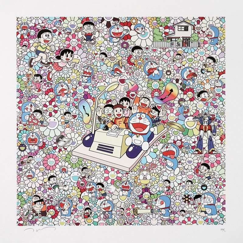 Offset. mm 420x420. Fogli: mm 500x500 cad. Entrambi riportano l'iscrizione con il nome di Takashi Murakami in basso a sinistra e la tiratura in basso a destra. Es. 280/700 e 142/700.