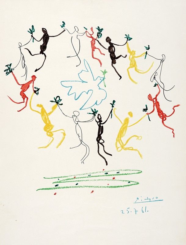 Coppia di manifesti a colori. mm 525/650x500/650. Entrambi firmati e datati in lastra. Poster tratti dai disegni originali di Henri Matisse e Pablo Picasso, il cui manifesto venne utilizzato nel 1962 come template per l'ottava giornata mondiale della giovinezza e degli studenti tenuta ad Helsinki.