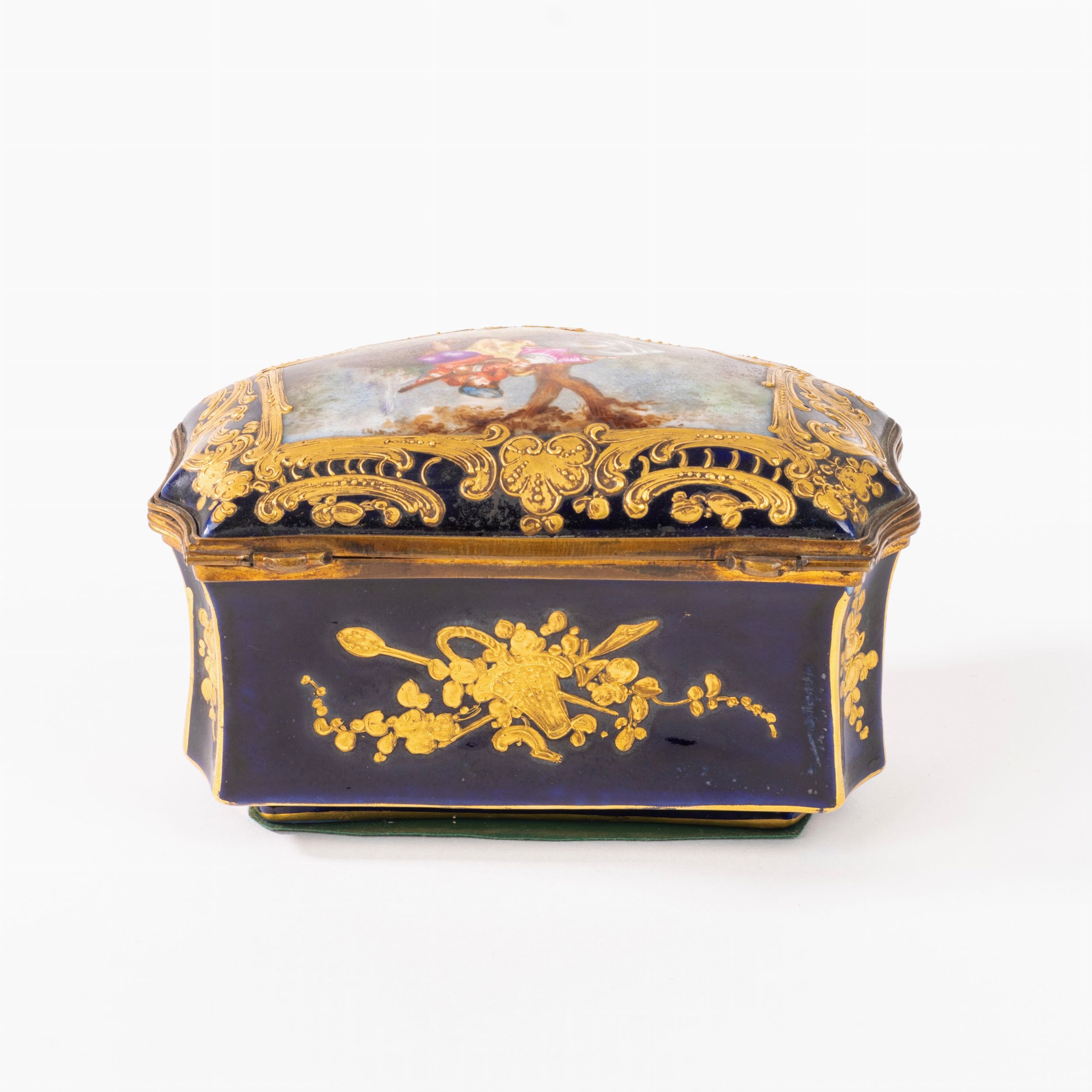 cm 8 x 14,5 x 10 decorato con scena galante sul coperchio e paesaggi sui lati, cornici a rocaille e composizioni di trofei musicali in oro finiture in bronzo dorato lieve filatura sulla base