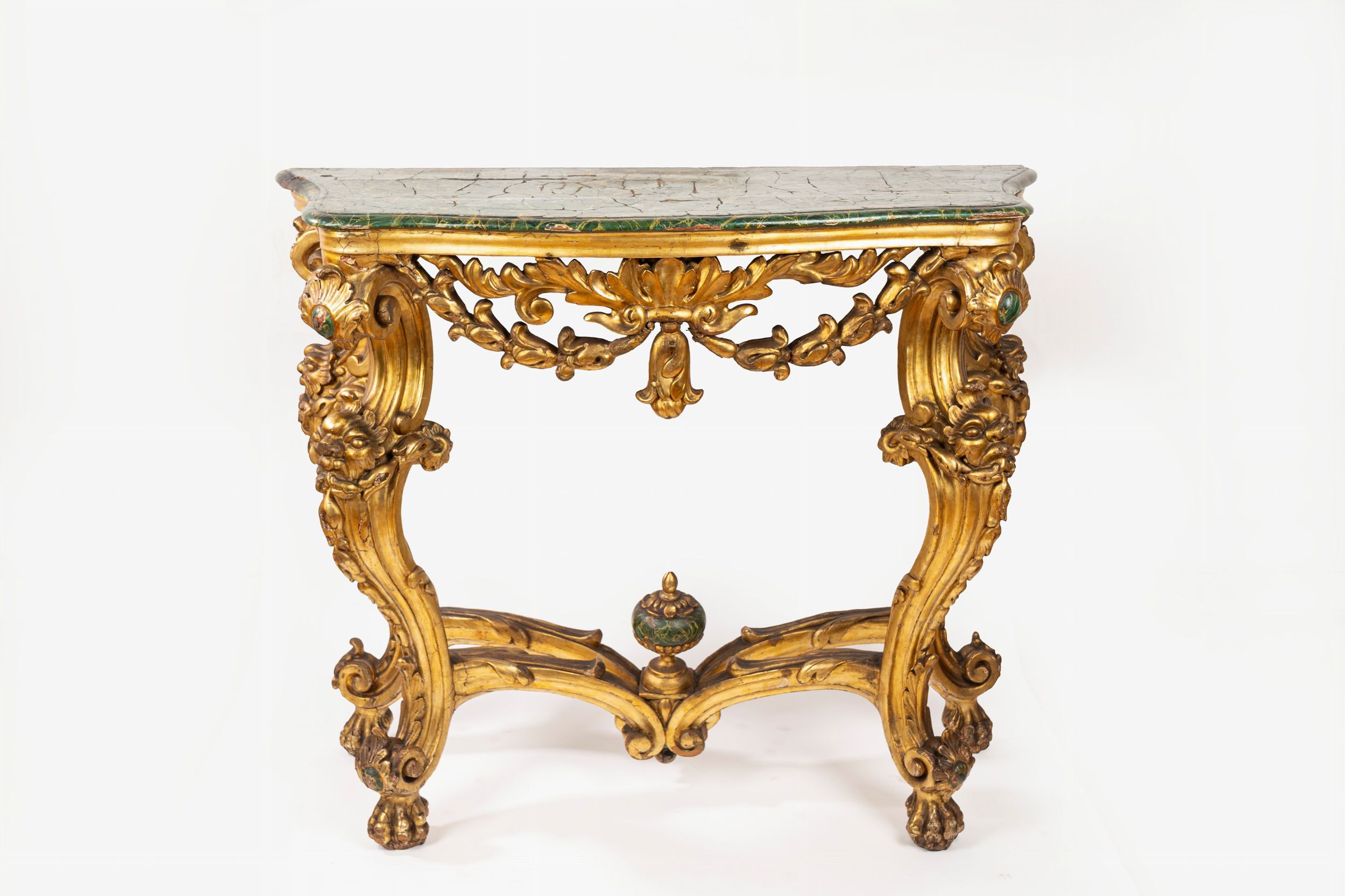 in legno intagliato e dorato, con piano in finto marmo verde, gambe riunite da crociera centrata da vaso in finto marmo verde che richiama il piano, quattro mascheroni e motivi a rocaille sulle gambe a doppia voluta, piedi leonini.