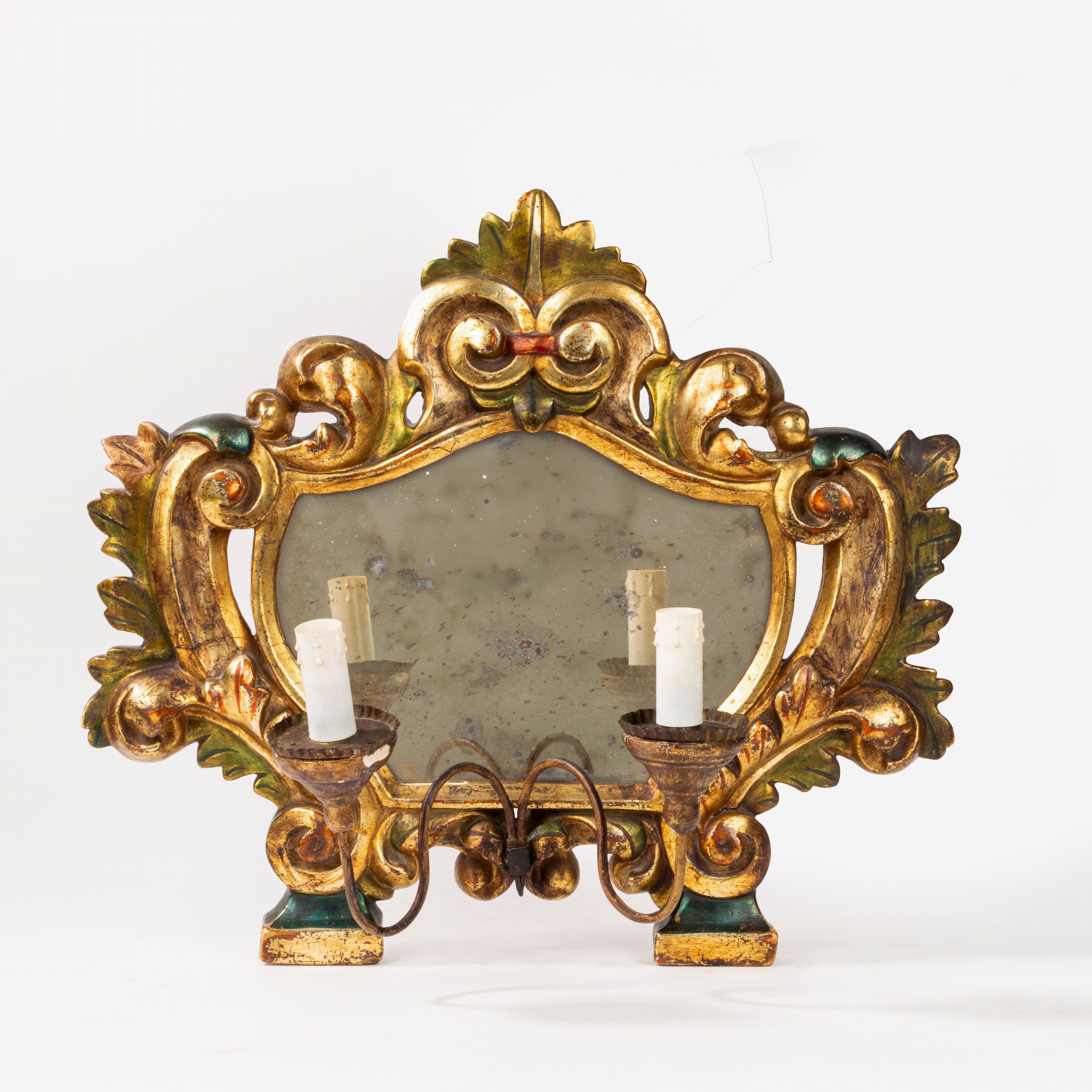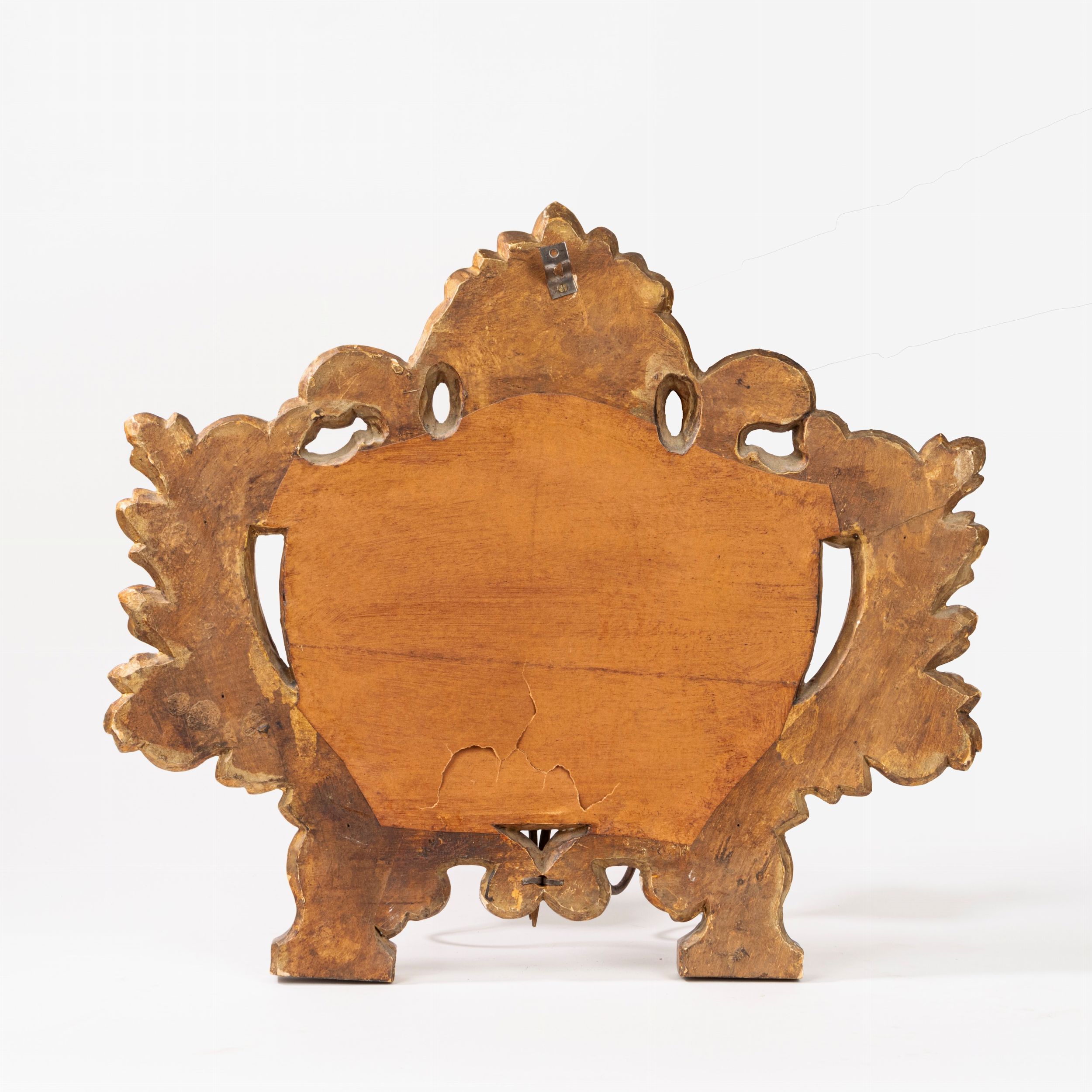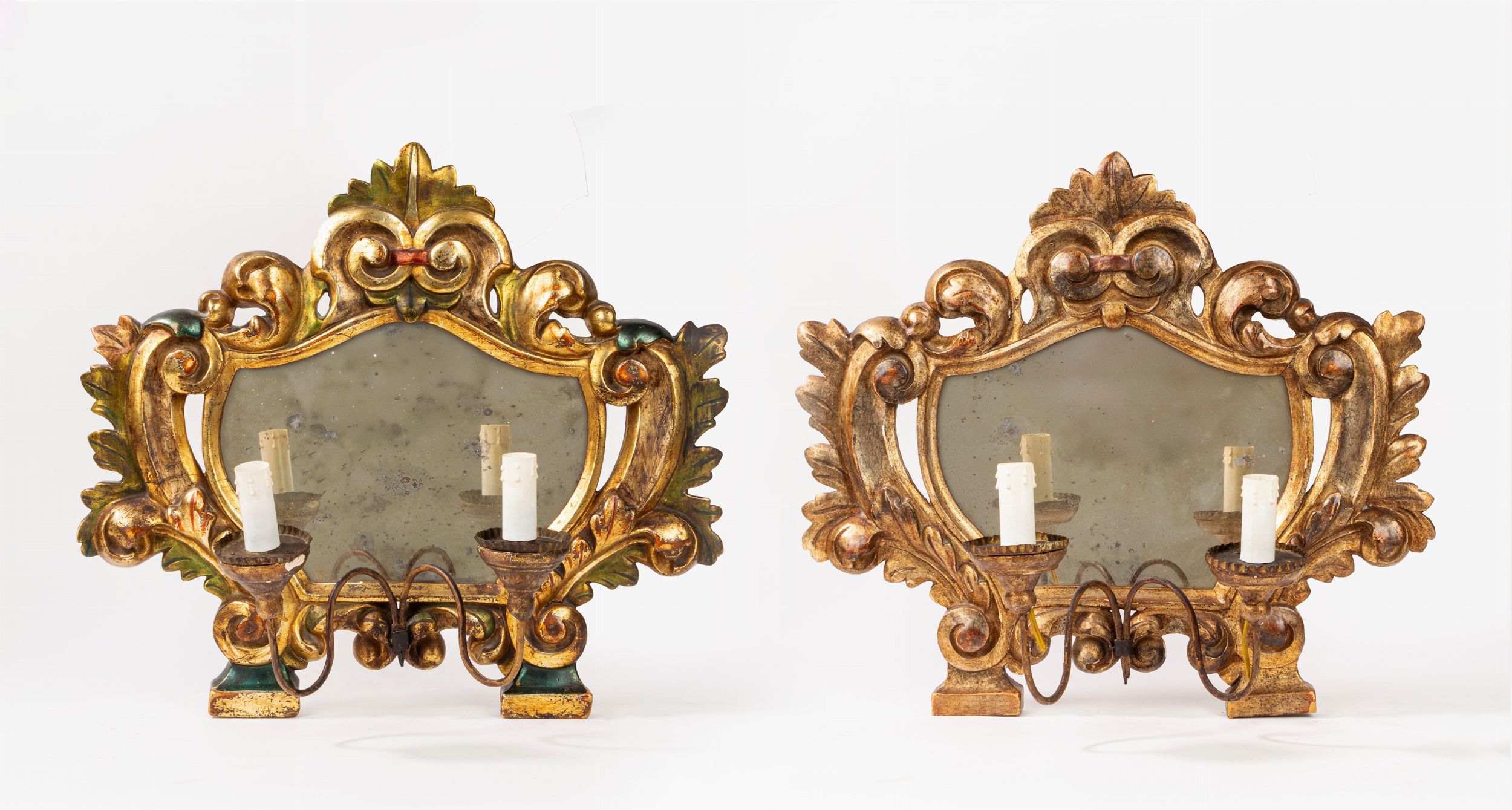 Coppia di cartaglorie in legno intagliato e dorato a volute fogliate