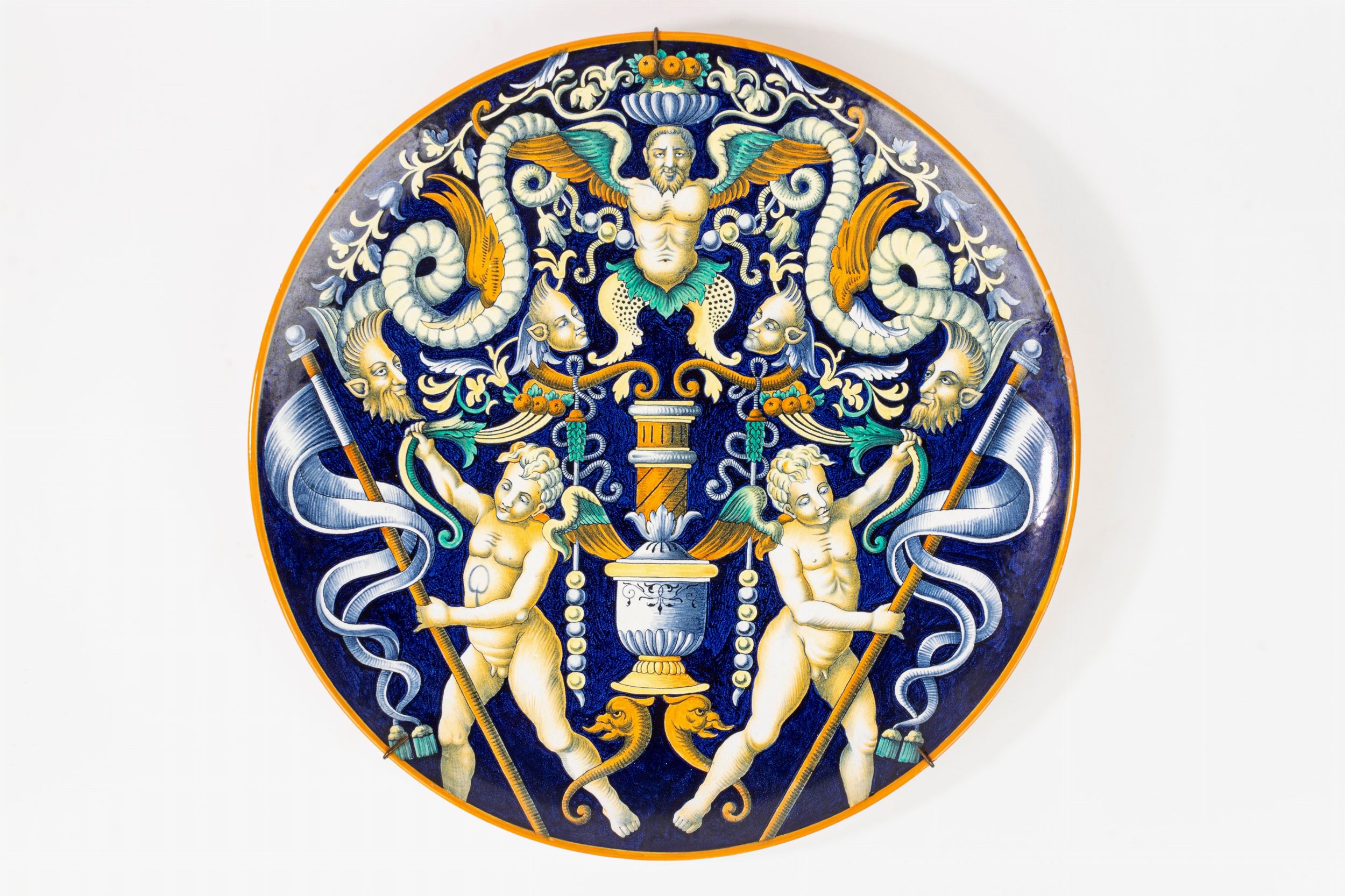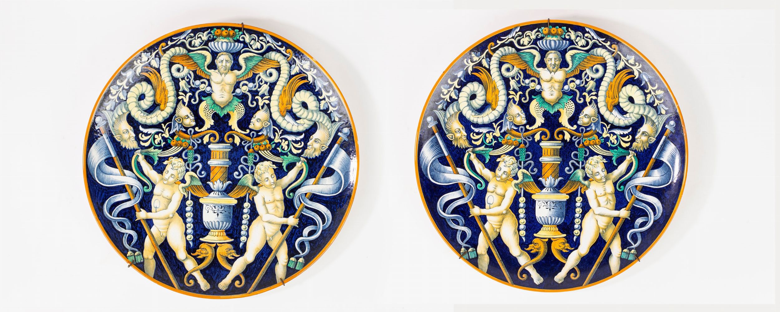 decorati a grottesche con putti alati su fondo blu di cobalto, bordo profilato in giallo ocra. Marcati e numerati al retro (lievi difetti)