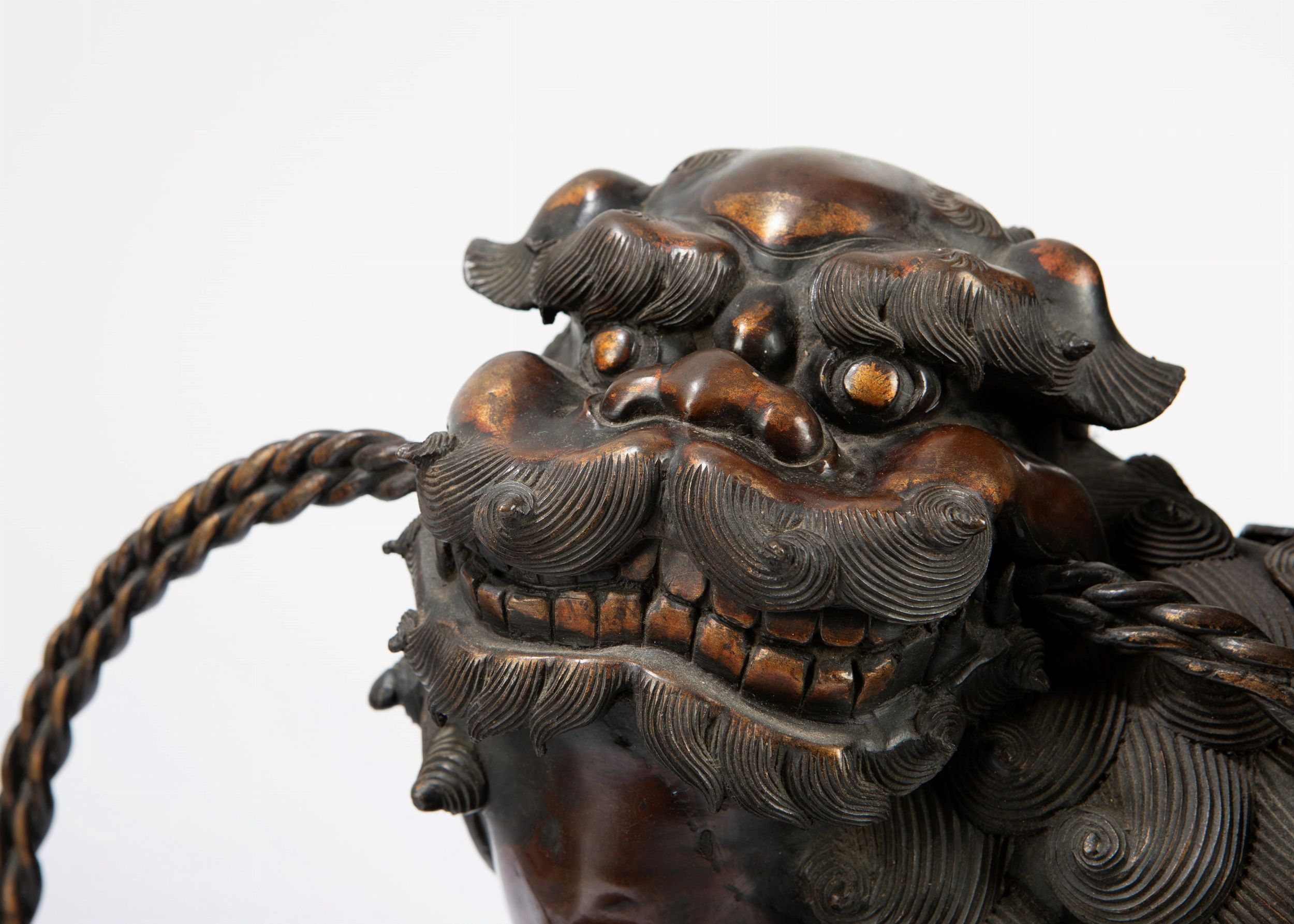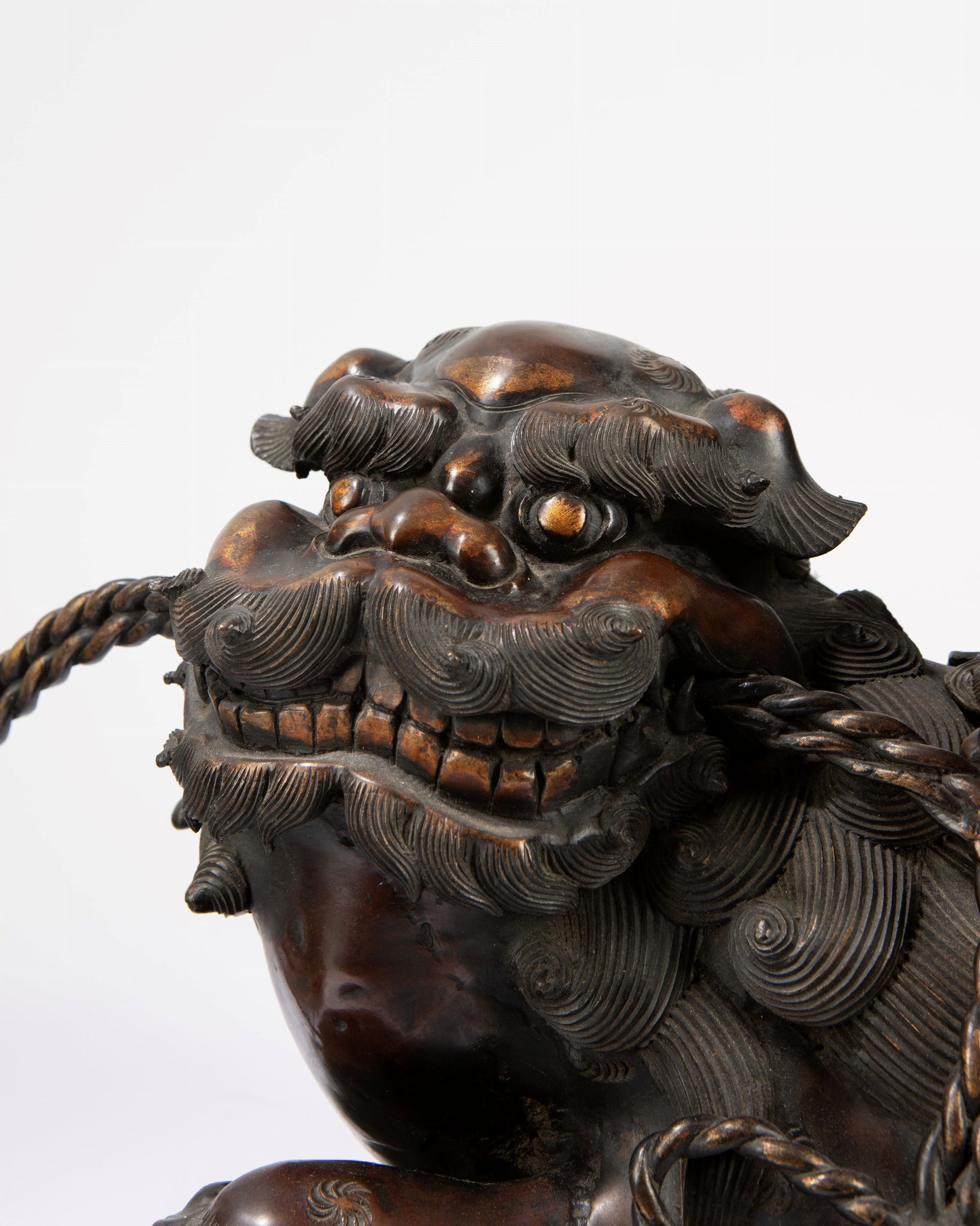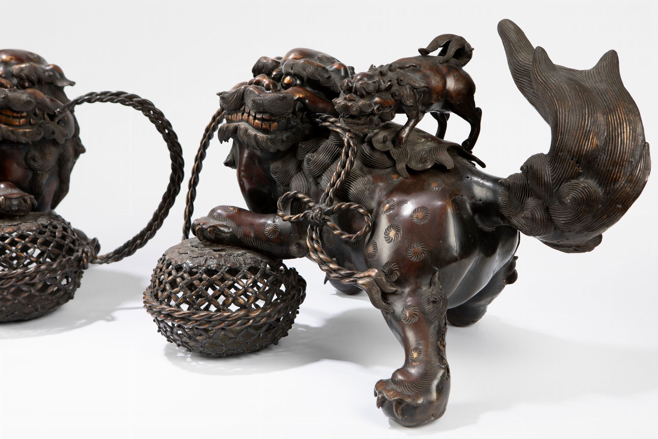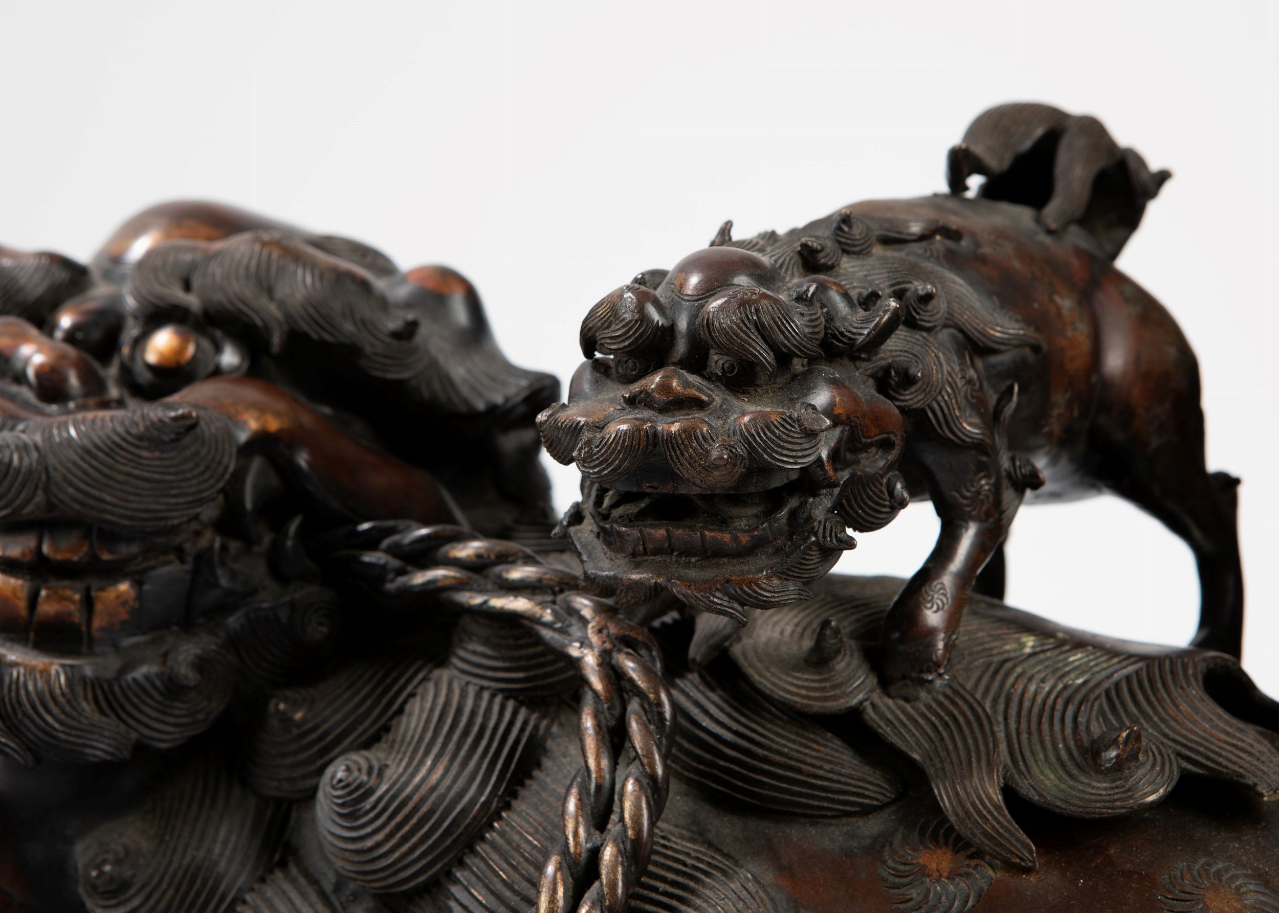 h cm 36 x l cm 72 Giappone, secolo XIX a foggia di leoni buddisti con mascelle potenti e un'espressione feroce enfatizzata dalle folte sopracciglia; la criniera ricca di ciocche arricciate, il corpo, decorato con fiori stilizzati, termina con grandi code rivolte verso l'alto, entrambi poggiano la zampa sinistra su una grande palla di broccato, mentre tengono tra le fauci un fiocco di corda ad esso collegato; sono sormontati sul dorso da due coperchi a guisa di cuccioli di leone (difetti) 石湾窑陶瓷凋塑六件,印度,19世纪