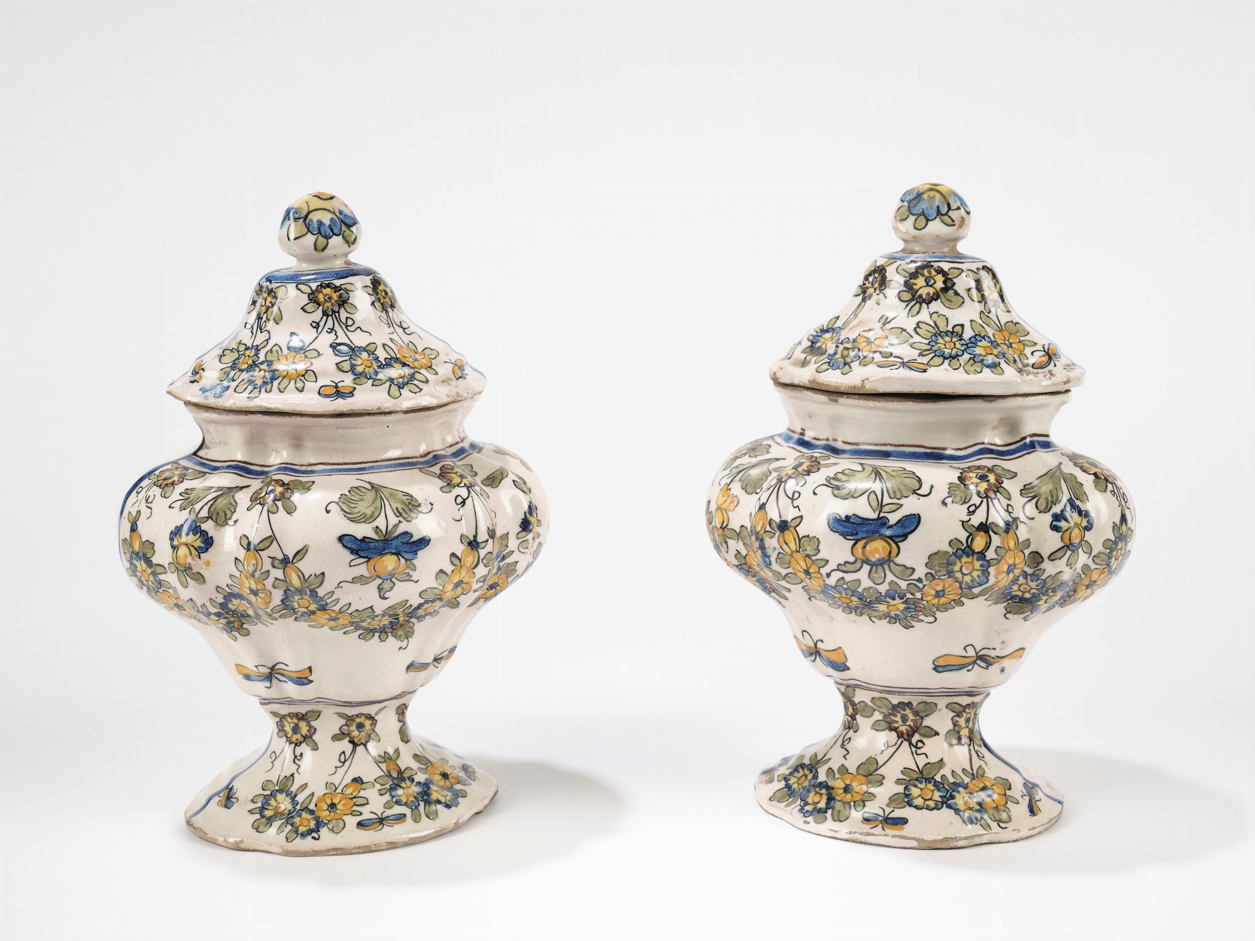 Due vasi con coperchio in maiolica policroma. Manifattura Cerreto Sannita