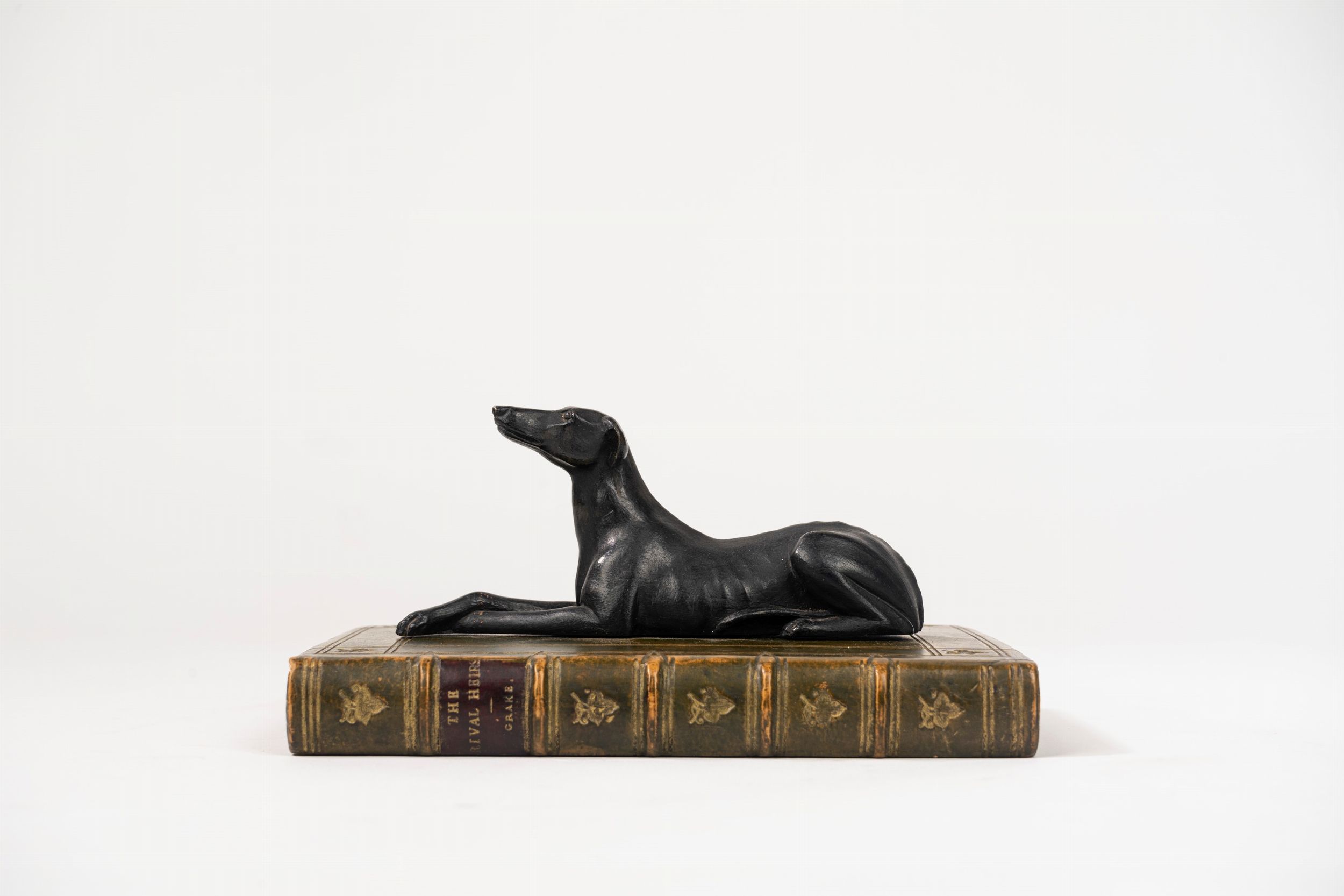 Fermacarte in legno dipinto a forma di levriero accovacciato su libro