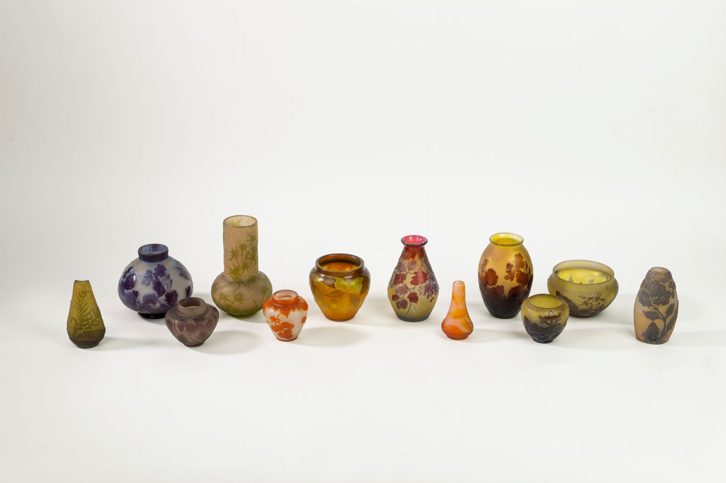 GALLE'. Collezione di dodici vasetti in vetro di varie forme e misure