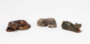 l max cm 5,5 Cina, XX secolo Raffiguranti un coniglio in agata e tre felini in giada.
