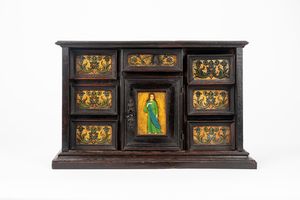 cm 29,5 x 47,5 x 22,5 fronte con sei tiretti laterali, uno centrale sopra anta celante vano, decorati con riquadri [..]