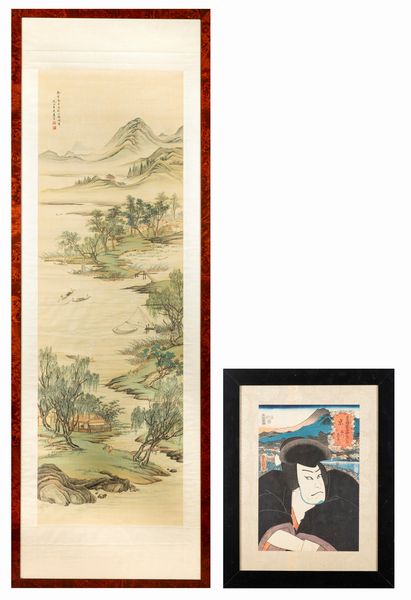 una è su seta e raffigura paesaggio fluviale; una raffigura una maschera teatrale