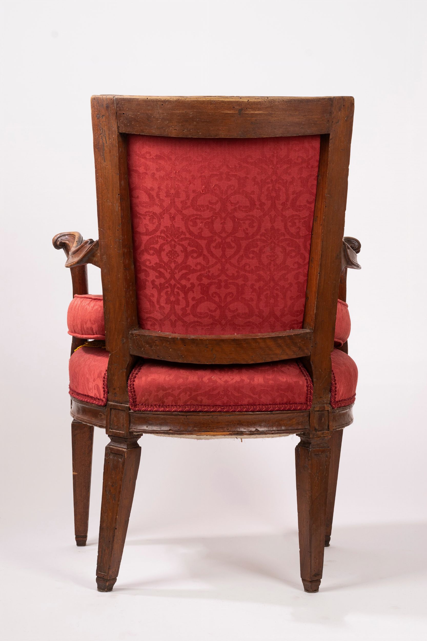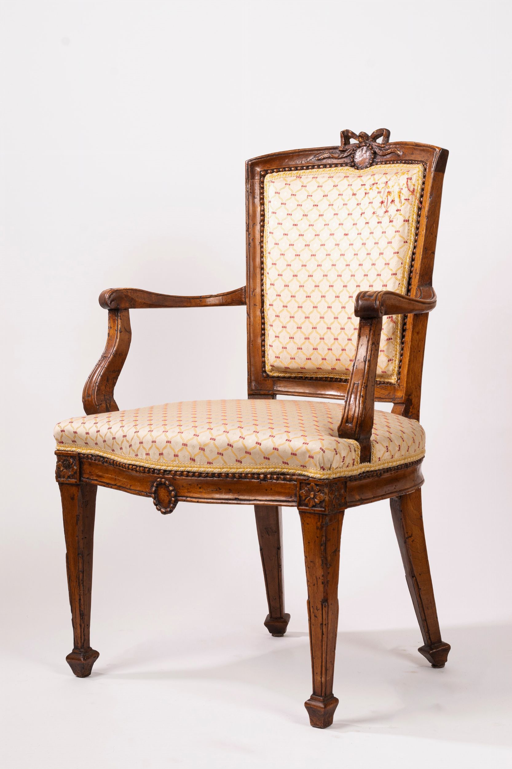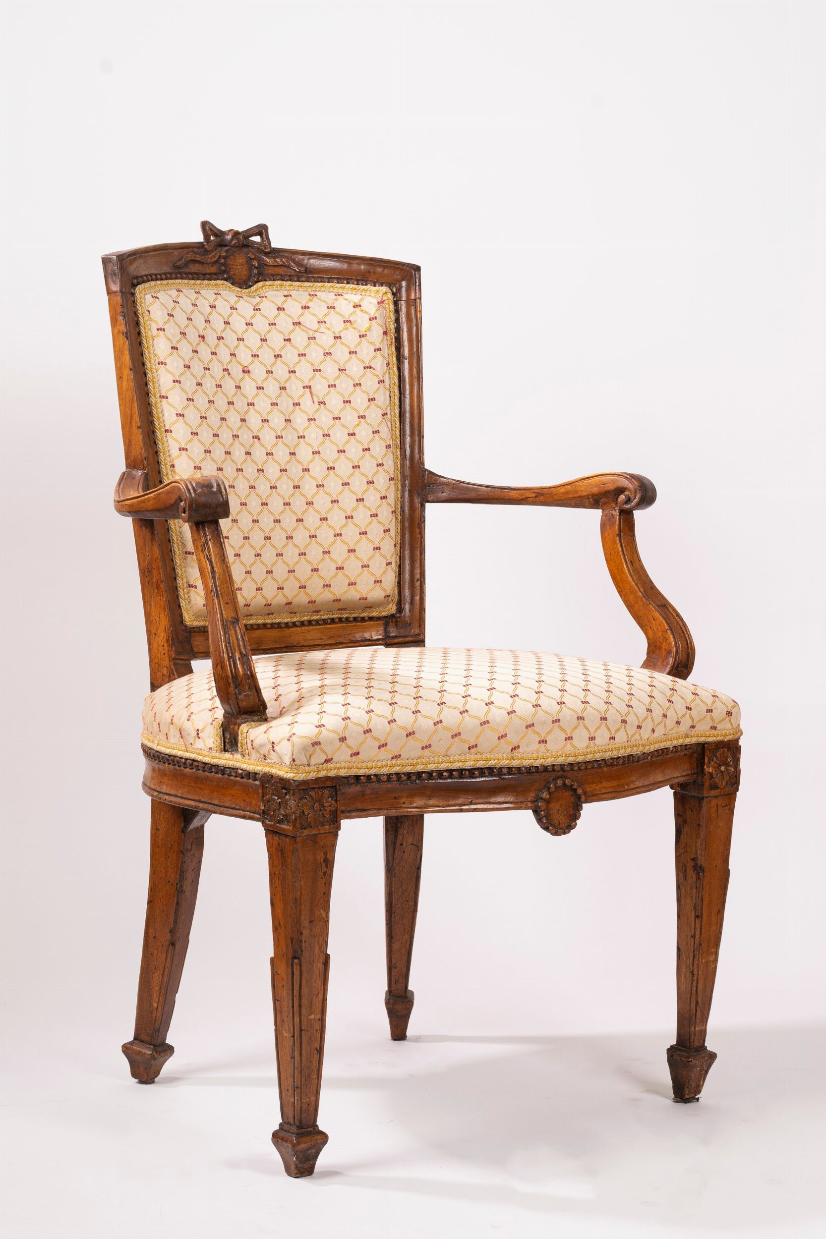 cm 88 x 55 x 50 (la coppia); cm 88 x 61,5 x 43 (la singola) con gambe rastremate con motivo floreale all'attacco, montanti mossi, braccioli terminanti a ricciolo e schienale di forma squadrata difetti e restauri