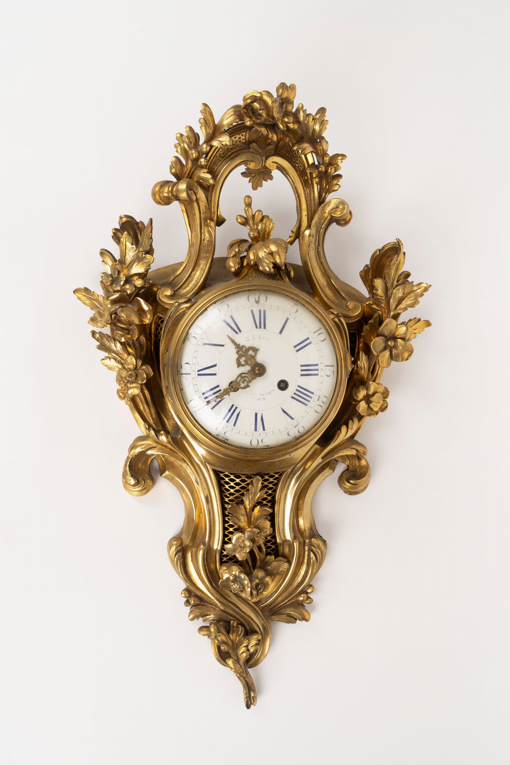 cm 59 x 36 x 10 cassa decorata a traforo, volute fogliate e fiori quadrante in smalto bianco a numeri romani per le ore e arabi per i minuti firmato G. L. Levy/29 rue Sevigne Paris movimento a due treni con suoneria delle ore e delle mezze su campanello