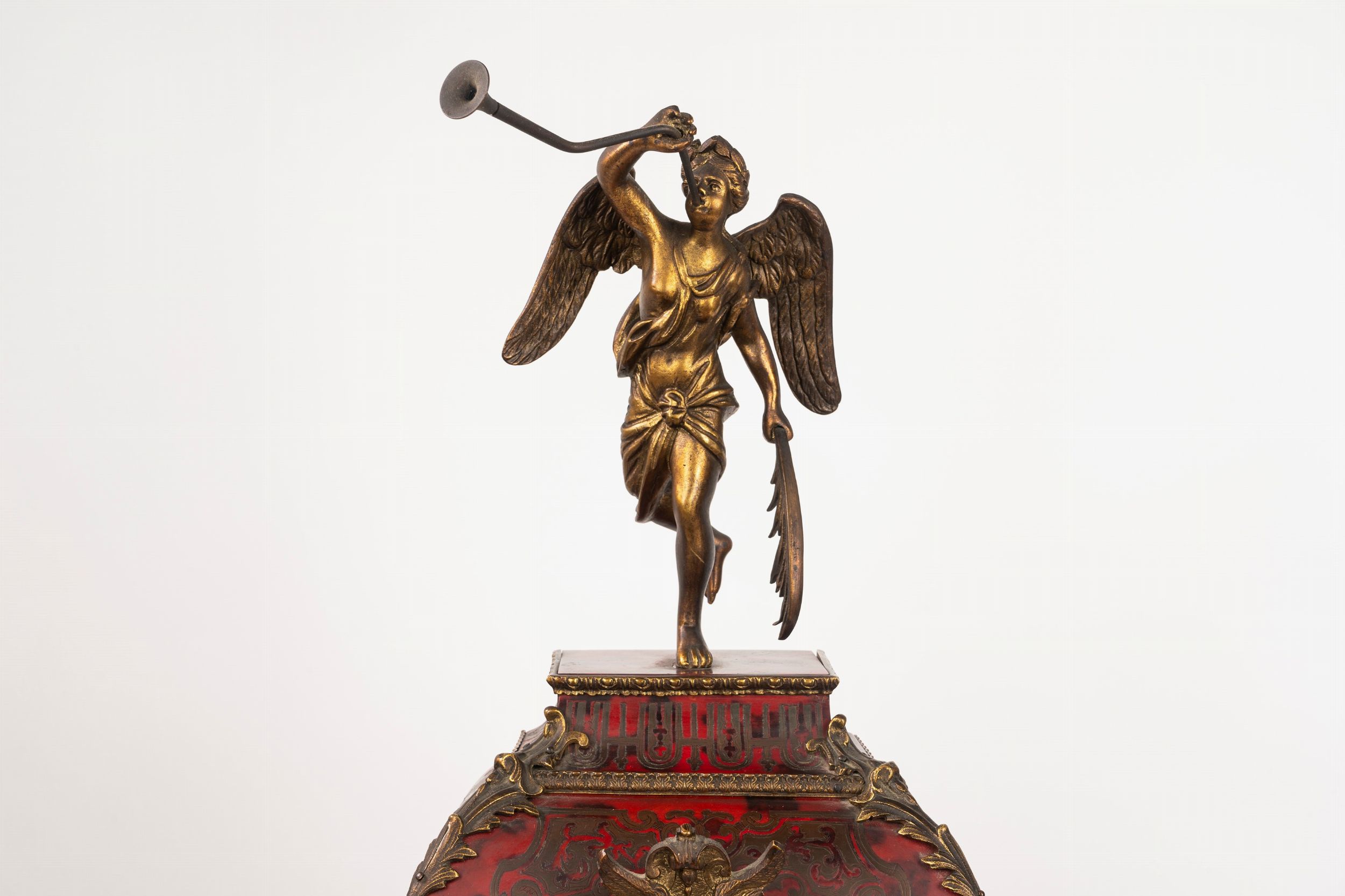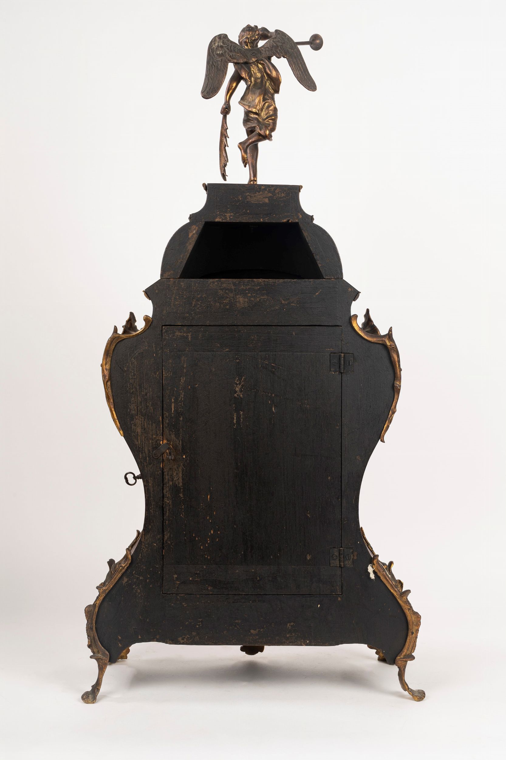 cm 76 x 37 x 15 quadrante a cartouche in bronzo e smalto a numeri romani per le ore e arabi per i minuti, terminale in bronzo raffigurante allegoria della Fama Il lotto è accompagnato da perizia