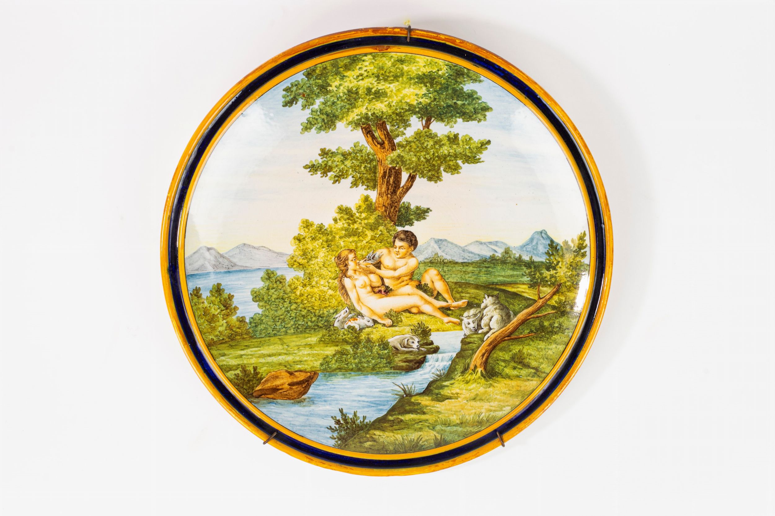 d cm 41,5 interamente decorato con due figure in un paesaggio bucolico, la tesa con bordo a fascia in blu di cobalto tra due profili a rilievo in giallo. Marcato, numerato e titolato 'L'innocenza' in blu al retro