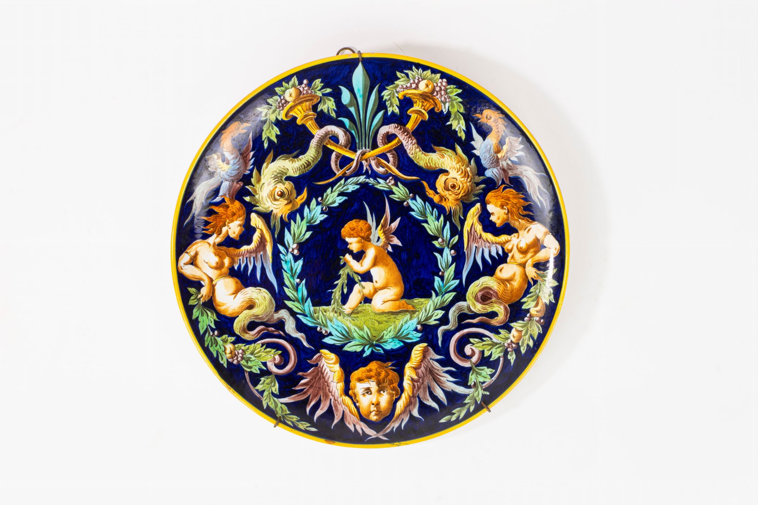 interamente decorato a grottesche e centrato da corolla con putto alato su fondo blu di cobalto, bordo profilato in giallo. Marcato e numerato in blu al retro