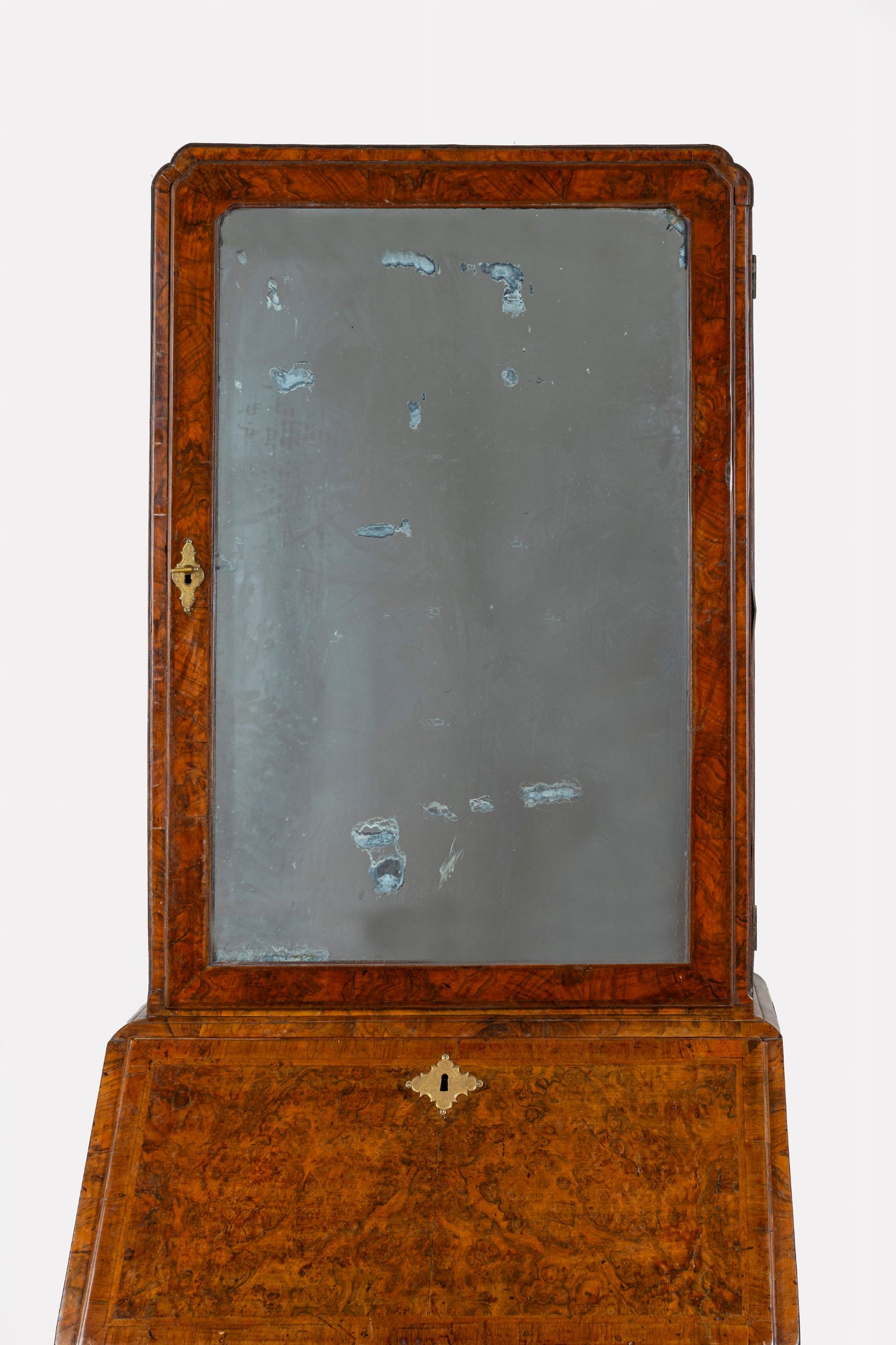 cm 187 x 69 x 44 parte superiore con anta a specchio celante due ripiani; parte inferiore a ribalta con fronte a tre cassetti e pianetto estraibile, con calatoia celante sei tiretti, sei vani e sportello centrale apribile piedi a mensola lievi difetti, restauri e sostituzioni