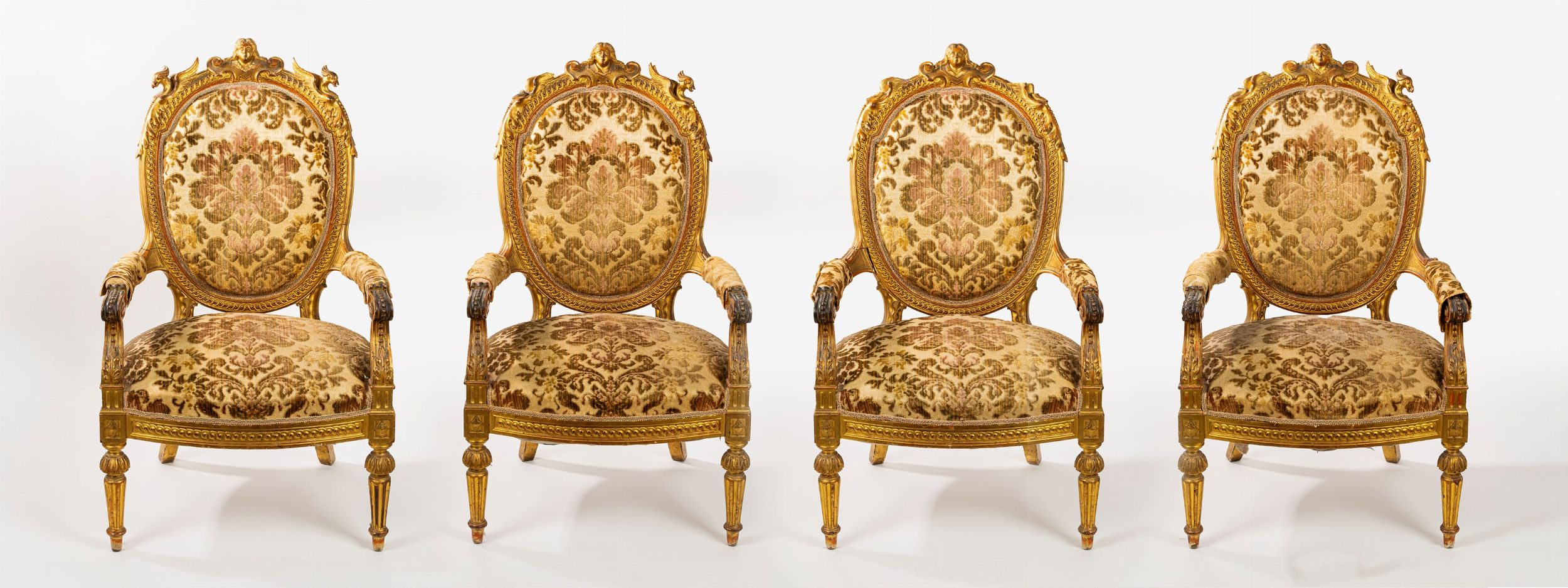 Quattro poltrone in legno intagliato e dorato, secolo XIX