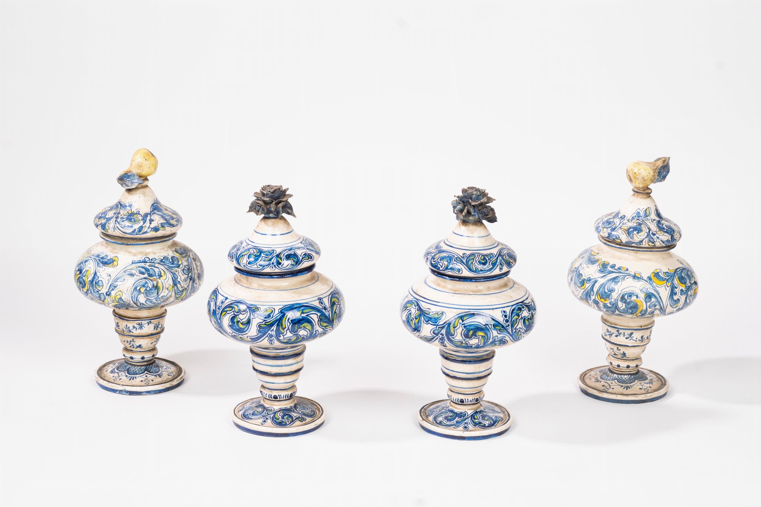 Quattro vasi con coperchio in maiolica policroma