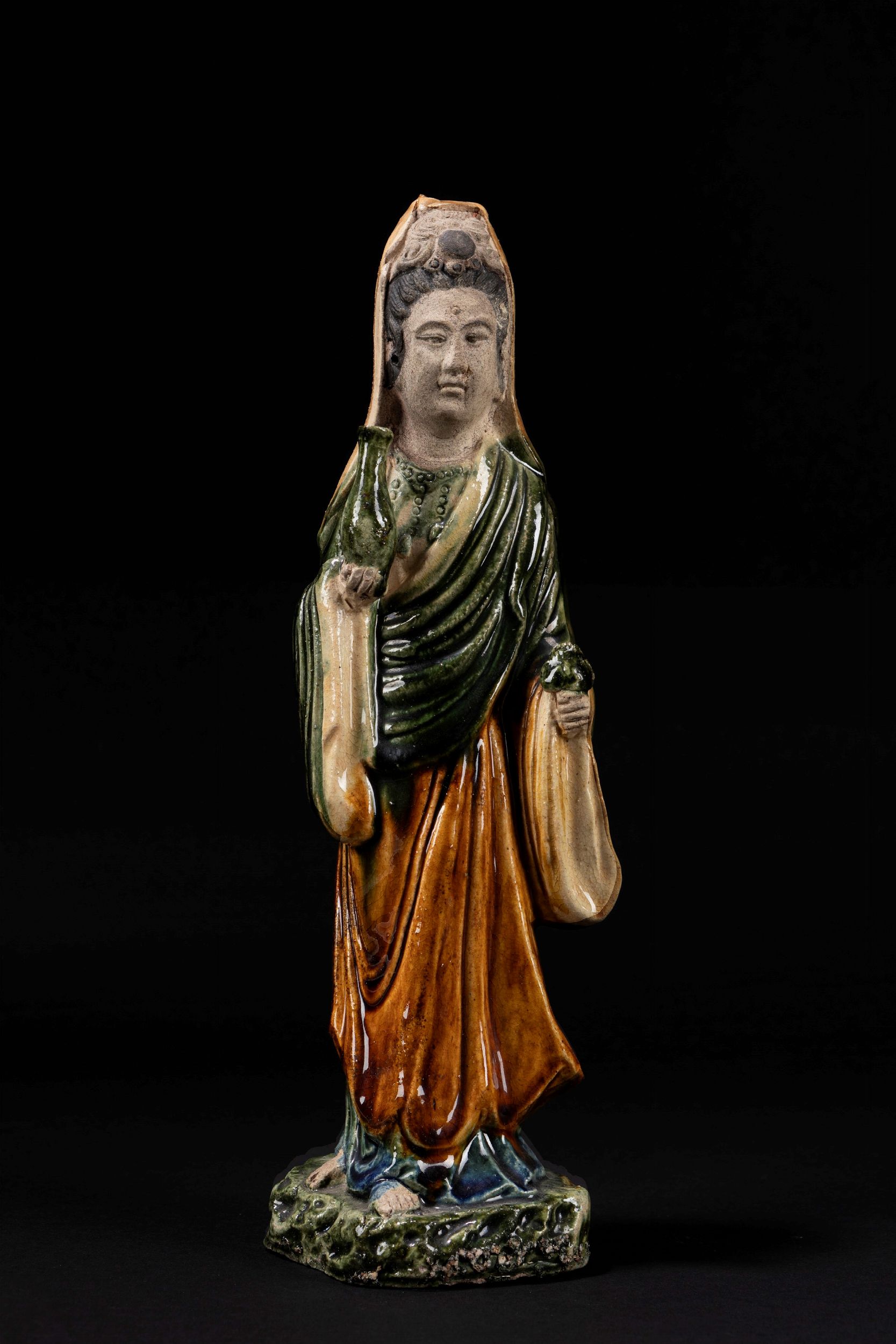 Cina, secolo XIX raffigurante dama elegantemente vestita reggente vaso 琉璃粗陶仕女凋像《三彩》,中国,19世纪