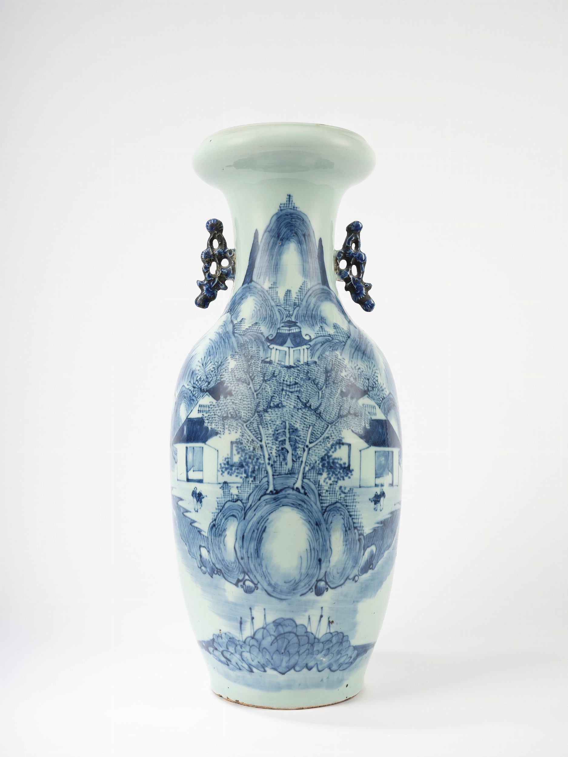 Cina, fine dinastia Qing a forma di colonna di balaustra, decorato sul corpo senza soluzione di continuità con paesaggio montano con pagode, alberi e figure 青花瓷青釉双耳瓶,中国,晚清时期