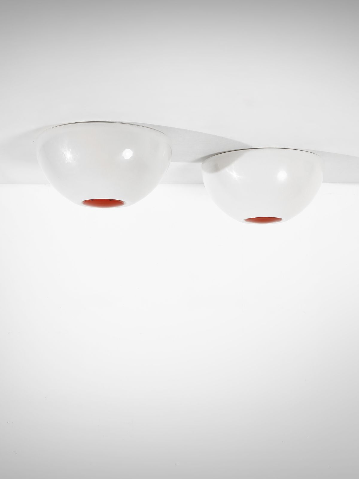 MARTINELLI LUCE Coppia di grandi lampade a plafone. Alluminio verniciato e metacrilato.. Cm 42x82x82. Anni Settanta.