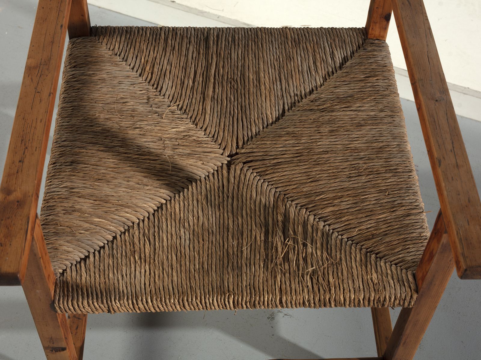 MANIFATTURA ITALIANA Coppia di poltroncine. Legno e paglia.. Cm 85x66,50x73. Anni Cinquanta.Etichetta metallica 'PREMIATA INDUSTRIA LAVORI MALACCA GIUNCO ECC LEONARDI UMBERTO VIA S.ROMANO N. 8 FERRARA'.