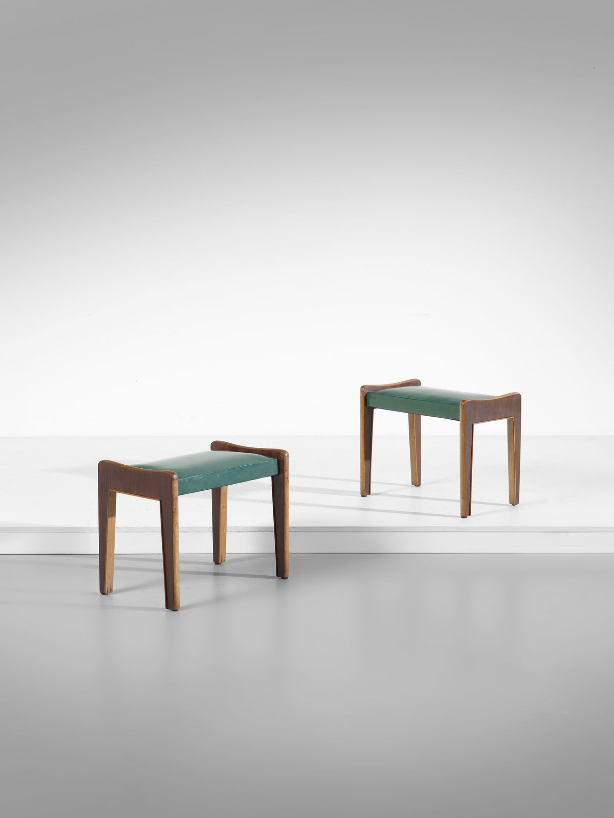 MANIFATTURA ITALIANA Coppia di sgabelli. Legno e vinilpelle imbottita.. Cm 44x55x35. Anni Cinquanta.