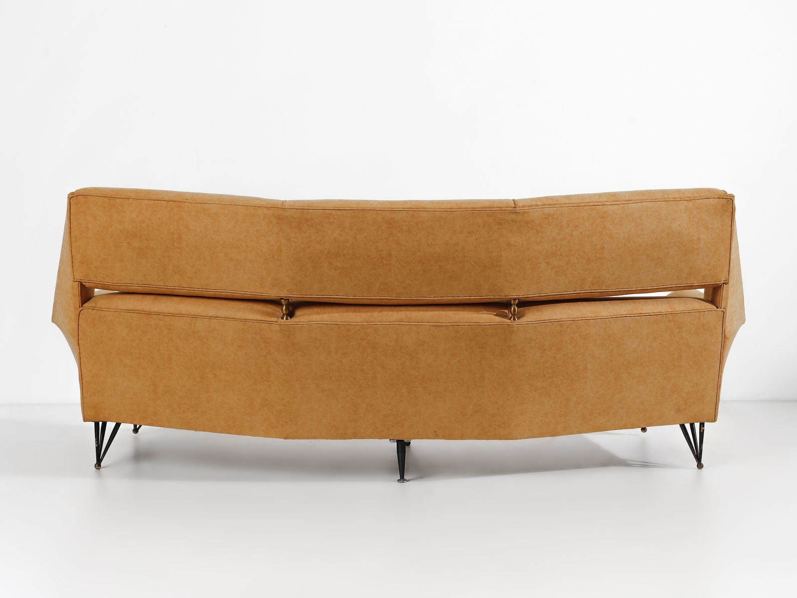 MANIFATTURA ITALIANA Divano a tre posti. Ottone, ottone verniciato e tessuto imbottito.. Cm 91x227x80. Anni Cinquanta.