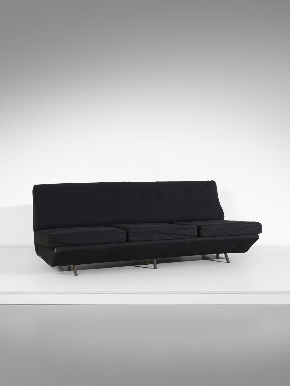 ZANUSO MARCO (1916 - 2001) Divano-letto a tre posti mod. Sleep-o-matic per Arflex, Milano. Metallo verniciato, ottone e tessuto imbottito.. Cm 71x190x85. Bibliografia: Giuliana Gramigna, Repertorio 1950-2000, Allemandi, Torino, 2003, p. 35.