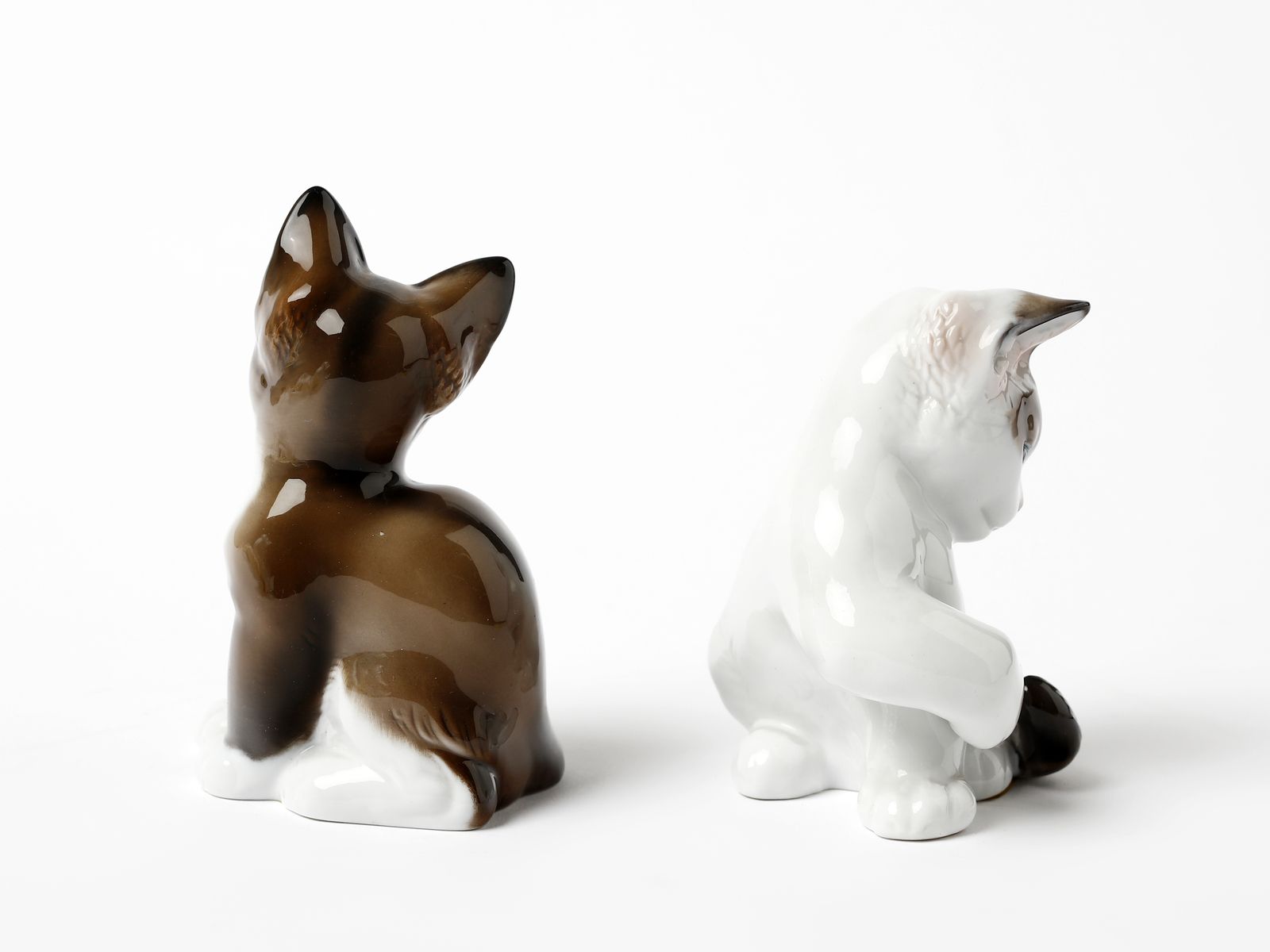 MANIFATTURA ROSENTHAL GattiDue sculture a tutto tondo, Germania. Porcellana smaltata in policromia.. . Seconda metà del XX secolo.Marchio sotto le basi.Dimensioni: 19 x 9 x 7 cm. 12 x 8 x 8 cm