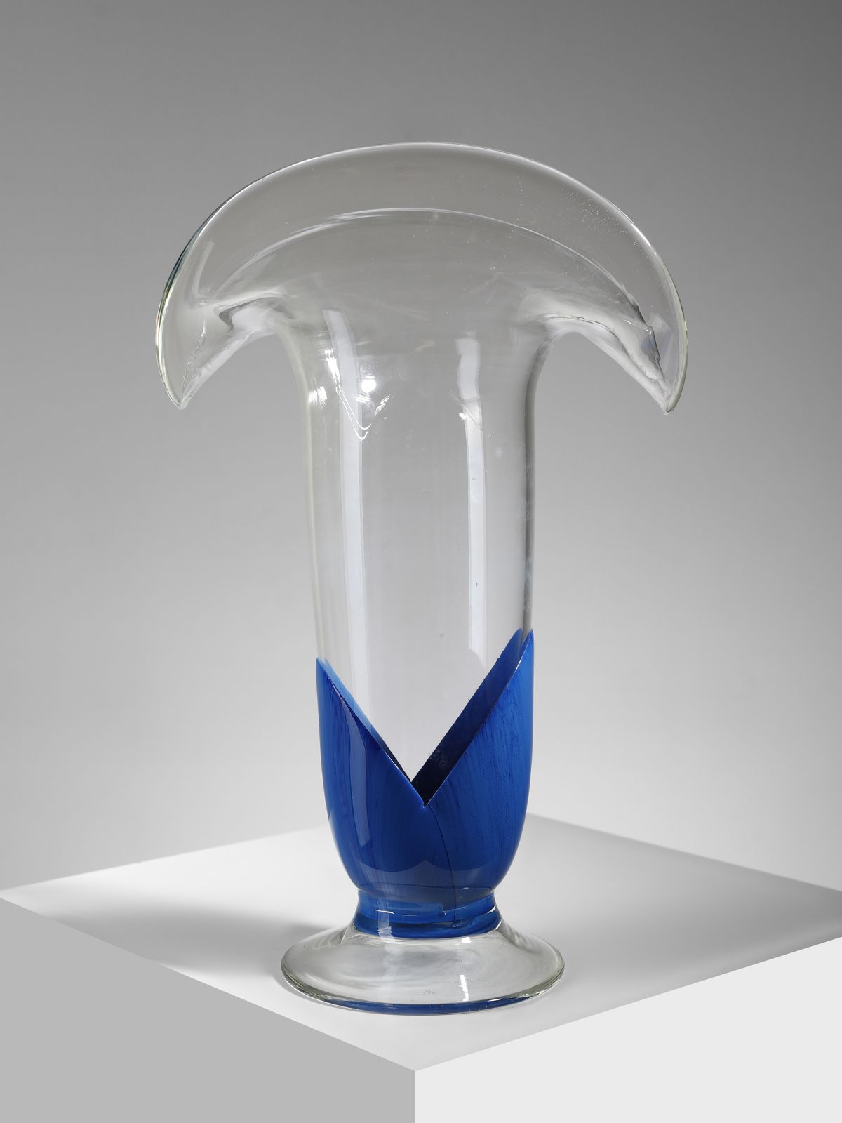 MANIFATTURA MURANESE Grande vaso con orlo allargato . Vetro cristallo con decoro in vetro blu calcedonio alla base.. Cm 43x19x30. Anni Ottanta.