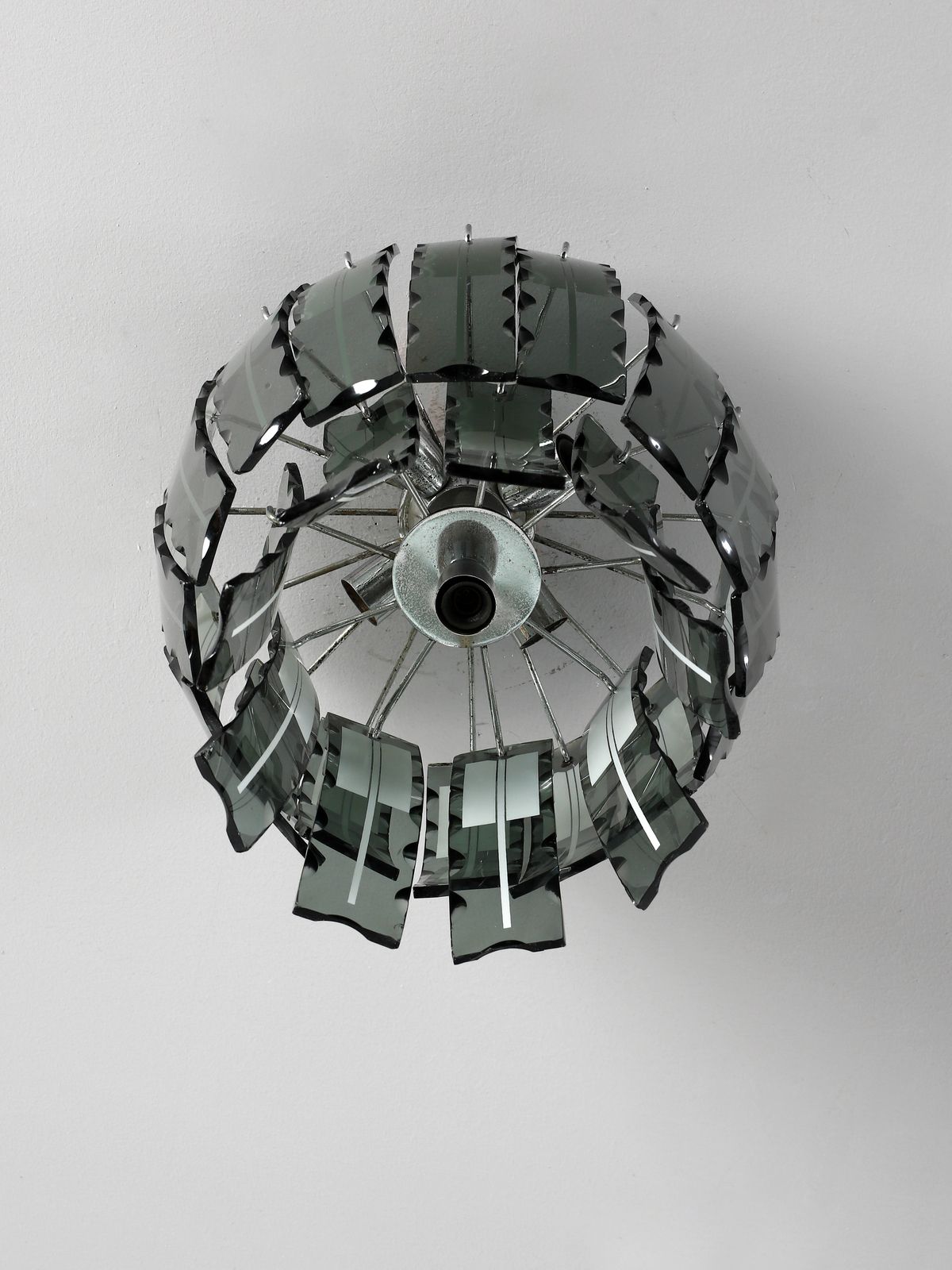 MANIFATTURA ITALIANA Lampada a sospensione. Metallo cromato e vetro.. Cm 40x44x44. Anni Settanta.