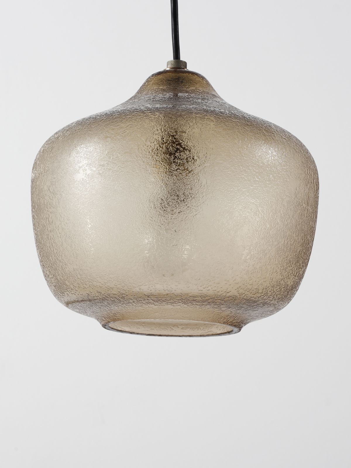 SEGUSO VETRI D'ARTE Lampada a sospensione, Murano. Vetro trasparente pagliesco corroso sulla superficie esterna, struttura in metallo nichelato.. Cm 22x26x26. Anni Sessanta.