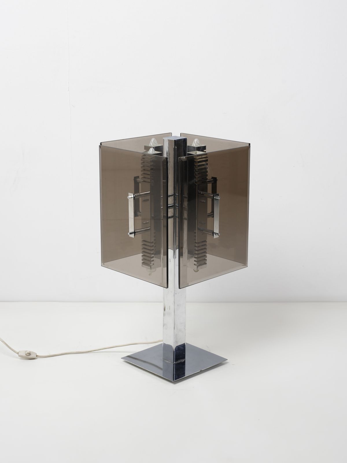 MANIFATTURA ITALIANA Lampada da tavolo. Acciaio e vetro. Cm 70x33x33. Anni Settanta.