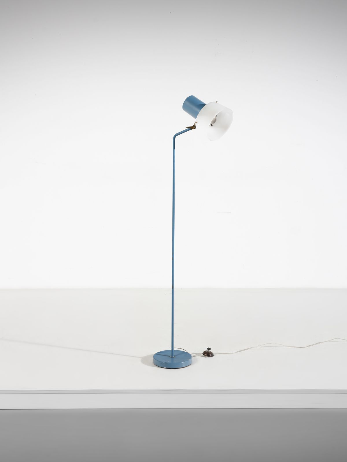 MANIFATTURA ITALIANA Lampada da terra. Metallo verniciato, ottone e vetro opalino.. Cm 145x40. Anni Cinquanta.